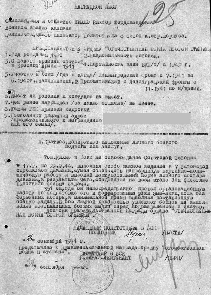 Laskurkorpuse poliitosakonna inspektor, kapten Viktor Kihno. Autasu saadud 354. Laskurpolgu koosseisus Emajõe forseerimise ajal. Kes tahab, loeb ise pikemalt.