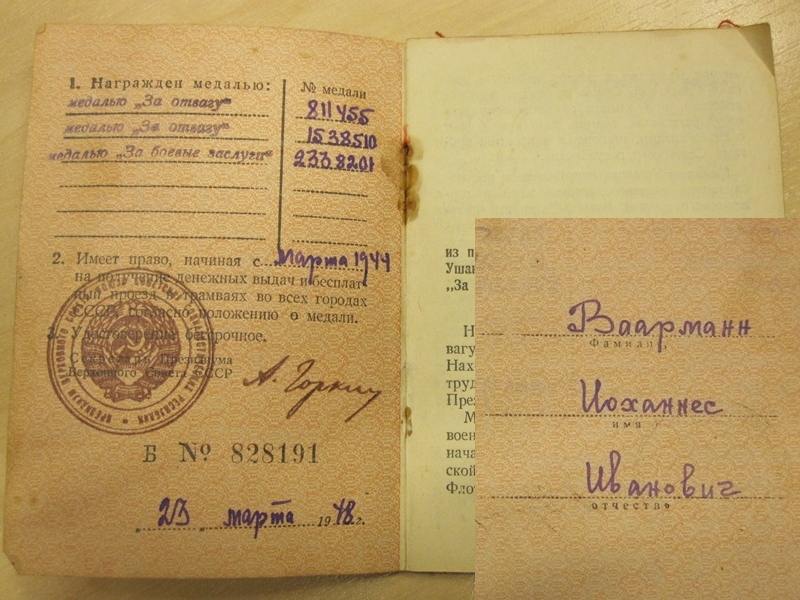 Aga nüüd 300. Laskurpolgu 7. Laskurdiviisi miinipildujate üksuse komandör seersant Vaarmann. Üks Lahinguteenete ja kaks Vapruse medalit, millest üks on puudu- rõngas on medali küljest ära murdunud. Vapper seersant- Rõzenino küla juures Pihkva oblastis sai 1944.a ühe Vapruse medali, Pikuli küla juures Lätis 1945 a. Lahinguteenete medali, mille eest teine Vapruse medal anti on veel hetkel teadmata.