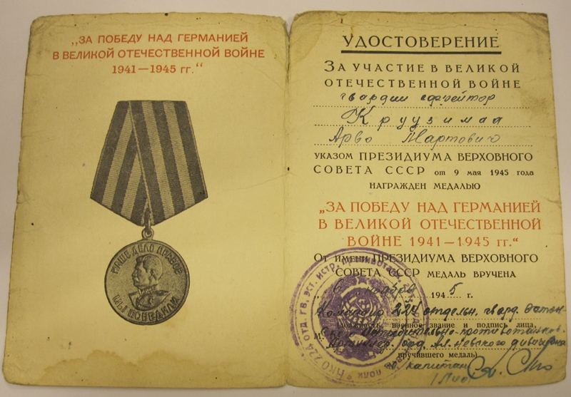 E. Laskurkorpuse 249. Laskurdiviisi 224. Üksiku tankihävitusdivisjoni radist, jefreitor Kruusimaa. Lahinguteenete medali kavaler.