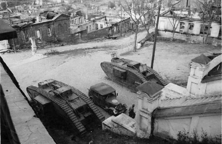 These two Mark V tanks were amongst about 60 (plus some Medium Mark As) sent to Russia by Britain in 1919, to help the White (i.e. Tsarist) Army fight against the Red Army. British troops accompanied them, officially to train the Russians, but they ended up actually manning the tanks in battle on occasion. After some successes, the tanks gradually fell into Soviet hands, and the British troops returned home, leaving the tanks behind.