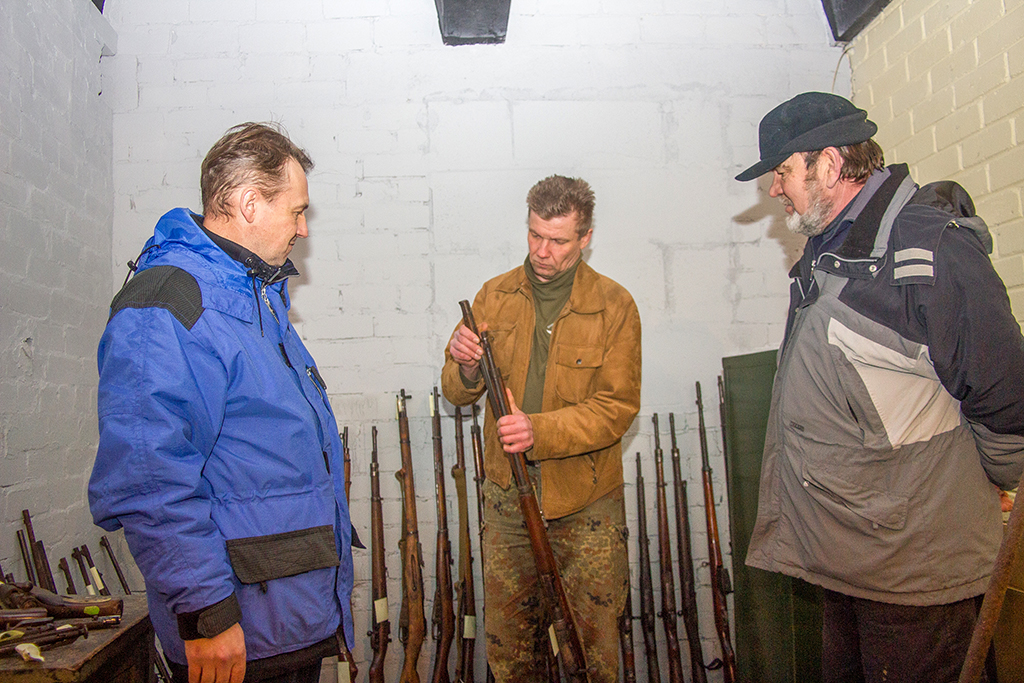 TAGASI HOIDLAS: Saaremaa sõjavara seltsi relvur Sergei Ruus, seltsi juht Margus Sinimets ja kollektsiooni looja Joel Nõukas tagasitoodud eksponaate üle vaatamas. Foto: Tõnu Veldre