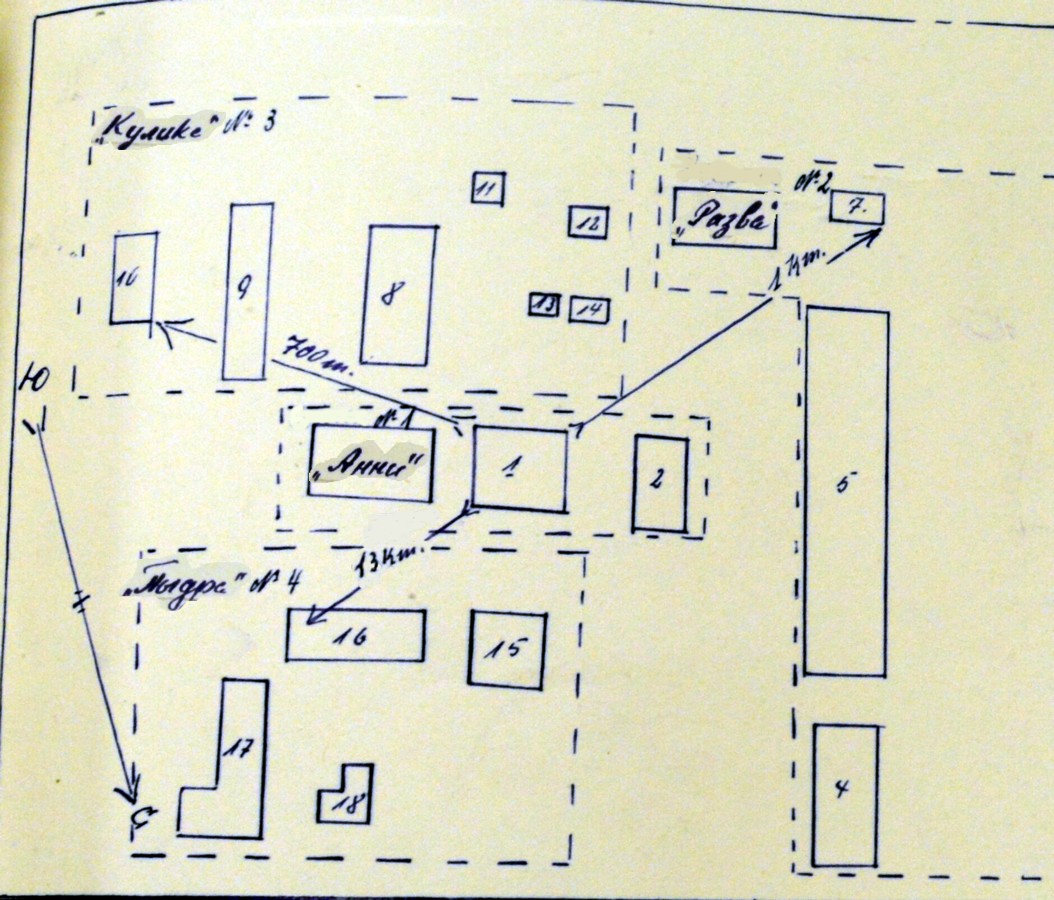 3. jaoskond Kulike - savist ja palkidest elumaja, milles 14 narikohta, kiviseinte ja kivikatusega hoone, milles 35 vangi - kahekordsed puunarid.