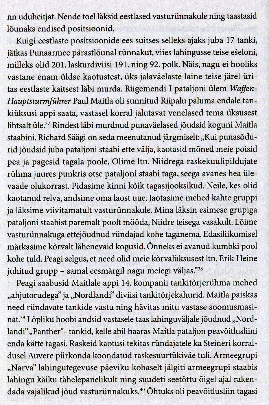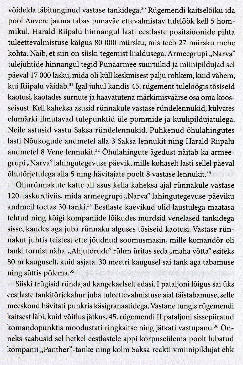 Uued pommid ja mürsud raksatasid punalaviini. Purukslastud tankid pahis-tasid Auvere maanteel. Nüüd seda kirjutades on see kui ennemuistne unenägu. Sinna teeveerele jäi 17 tanki suitsema. Meie ette kuhjus 2000 - 3000 venelase elutut keha. 24. juulil kindral Maslennikov, Eremenko üksused 80 diviisi tugevu¬sega üritasid Irboska, Narva rindel meie maad vallutada - meid ründavast diviisist ei jäänud palju järele.