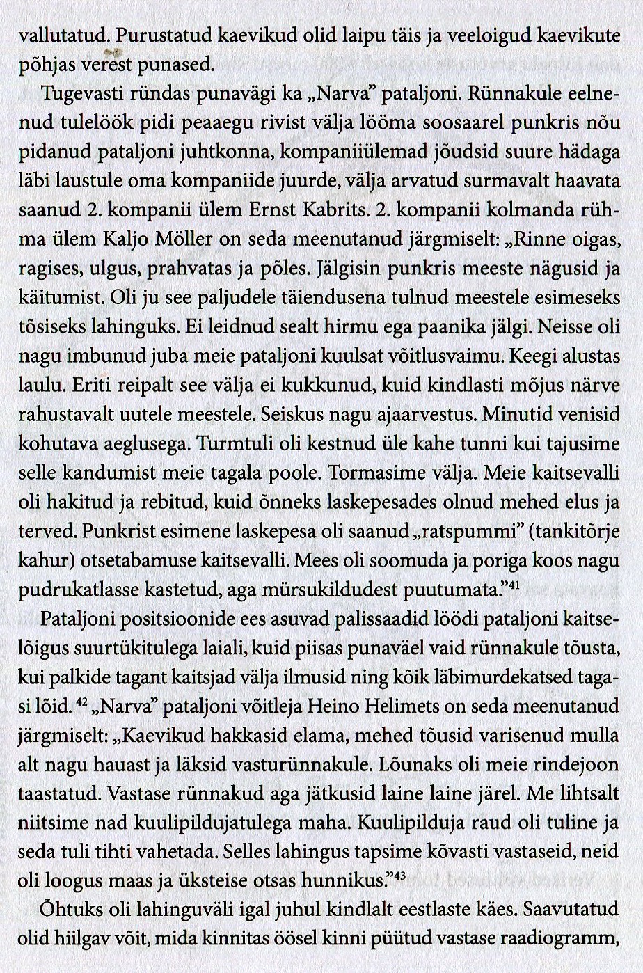 Venelaste kahurid alusta... uut tule ette... nende rünnakuks. Mulle paistab, et neil pole puudu laskemoonast ega inimmaterjalist. Nad roomavad meist liht¬salt mööda. Maa kamakad puu juurtega taas lendamas õhus nagu loobiksid poisikesed lumekäkke ägedas lumesõjas. Kõik see tohutu möll kajab metsaservalt vastu. Tuhanded haavatud, verest läbiimbunud pluusides katsuvad leida teed omade juurde. Paljud neist saavad veel viimase matsaka, pannes neid igavesele unele. Mõned jooksevad. Üks venelane, katsudes tagasi joosta, sai käkilt lahmaka. Ta pea lendas nagu... suures kaares maandudes soisel pinnal, aga ta keha jooksis edasi võnkuval jalgel oma paar meetrit. Venelasi langes loogu. Nagu heina niites tabasid meie kuulipilduja valangud nende ridu. See pole sõda, see on hullumeelsete inimeste tapatalgu. Põlevad tankid tee ääres sulgesid tee järeltulijatele. Meie rünnakkahurid ja... alustasid vasturünnakut. Me poistest ei taandunud keegi ses hirmus... tahtis mu mõistuse segi ajada. Süda lööb kas hirmust või muidu pingutusest ja tahaks nagu täidest söödud kehast lihtsalt välja rabelda. Ainus soov oli sellest põrgust mis sellel momendil käis... ja surma keridagi... seda.