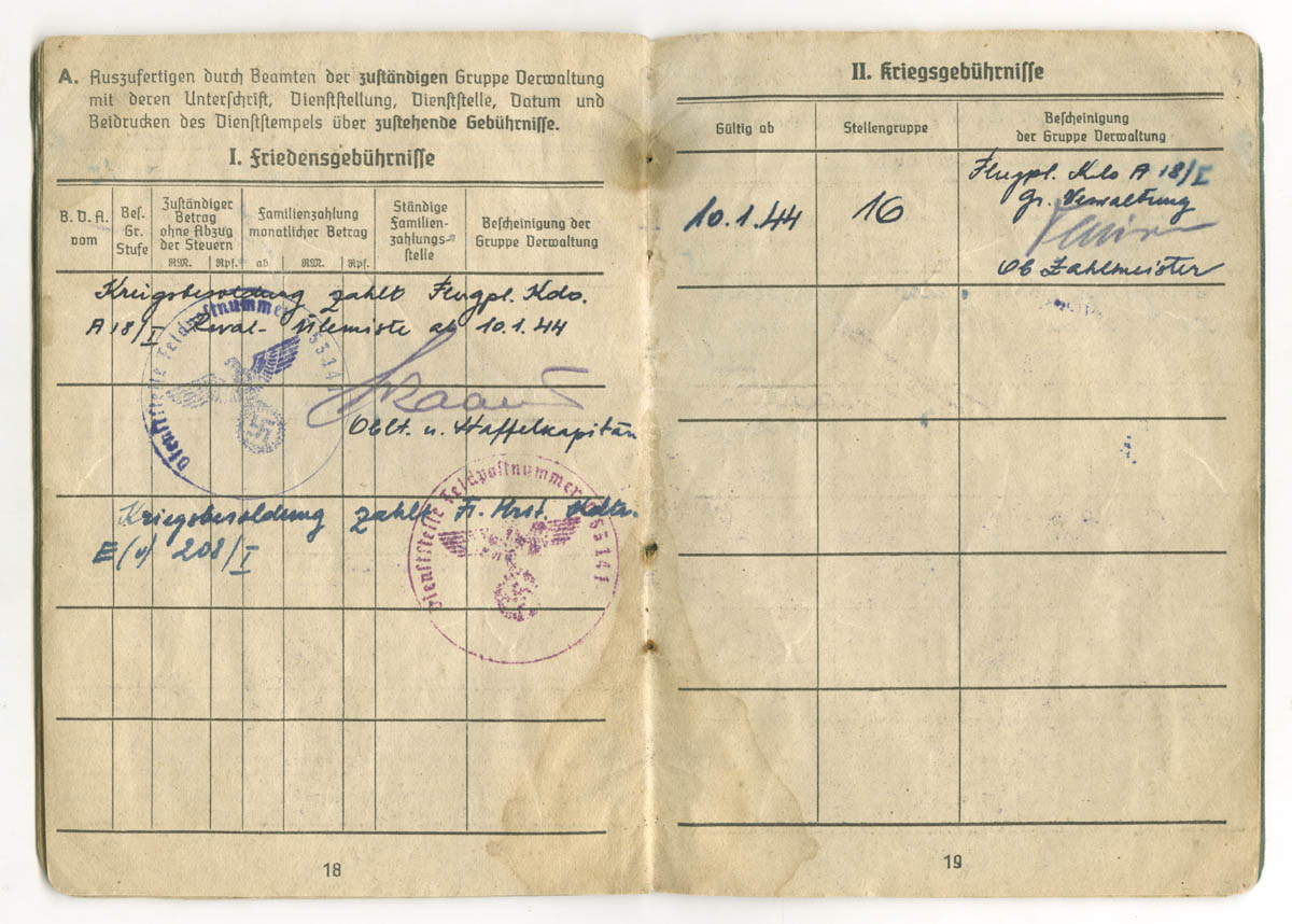 Teema on küll Soldbuch'idest aga postitan siia siiski lisaks ka ühe eestlase Lohnbuch'i, mis on kuulunud kasutaja nublu poolt mainitud organisatsioonis ametis olnud mehele.nublu kirjutas:Algul oli seal sakslaste tsiviilremondiorganisatsioon Frontreparaturbetrieb GL Reval Espenlaub, see kolis siit aga 1943. a. sügisel Riiga. Siis avati samades ruumides puht sõjaväe ettevõtmine Werftabteilung 101/I (kus I seal lõpus näitab jällegi Luftflotte I allumist), mille ülemaks sai senini Ülemistel lennukite remondiga tegelenud Herbert Joari. Ilmselt kolis sinna Werftabteilungisse üle enamus Espenlaubi kohalikke töötajaid ning nagu näha - mõned mehed ka Ülemistelt.