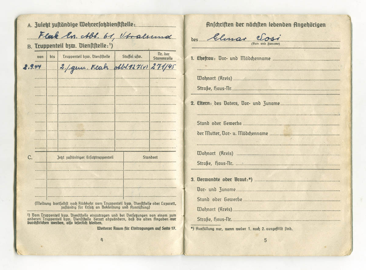 1927. aastal sündinud Elmar Sosi mobiliseeriti 1944. aasta augustis ja määrati koos paljude teiste 1927. aastal sündinud Pärnumaa poistega 127. Flak Abteilung'i koosseisu. E. Sosi sattus üksuse 2. patareisse, mis oli (kui ma nüüd ei eksi) raskepatarei ja relvastatud 88 mm õhutõrjekahuritega. 1944. aasta septembris liikus ta koos oma üksusega Lätti, kuhu jäi kuni sõja lõpuni. 1945. aasta 8. mail õnnestus sealt üksusest seitsmel eestlasel põgeneda Rootsi. 1946. aastal 25. jaanuaril andis Rootsi valitsus nad venelastele välja. LW Helfer / Kanonier Elmar Sosi oli üks seitsme hulgast.
