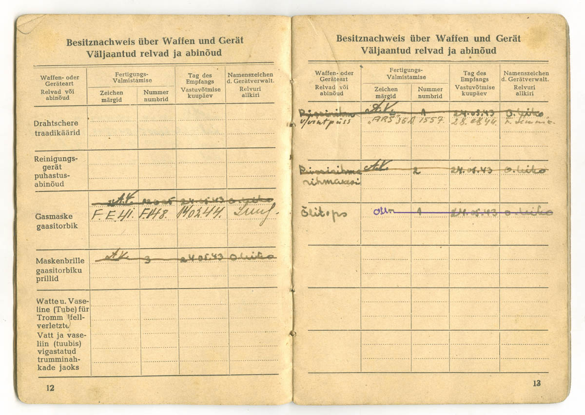 Auglale on vahemikus 1943. mai kuni 1944. veebruar välja kirjutatud neli 7,62 kaliiber vintpüssi, millest kolm esimest on maha kriipsutatud. Kas relv anti laost välja kui üksus liikus rindele / haarangule ja tekkis otsene vajadus tulirelva järele? Hoopis huvitav märge on aga palgaraamatu 13. leheküljel - v/vintpüss "ARS" 36 A nr. 1557. See, järjekorranumbriga juba viies vintpüss on talle välja antud 1944. aasta 28. augustil - kas see "ARS" võib tähendada meie oma Arsenali sõjatehase toodangut?