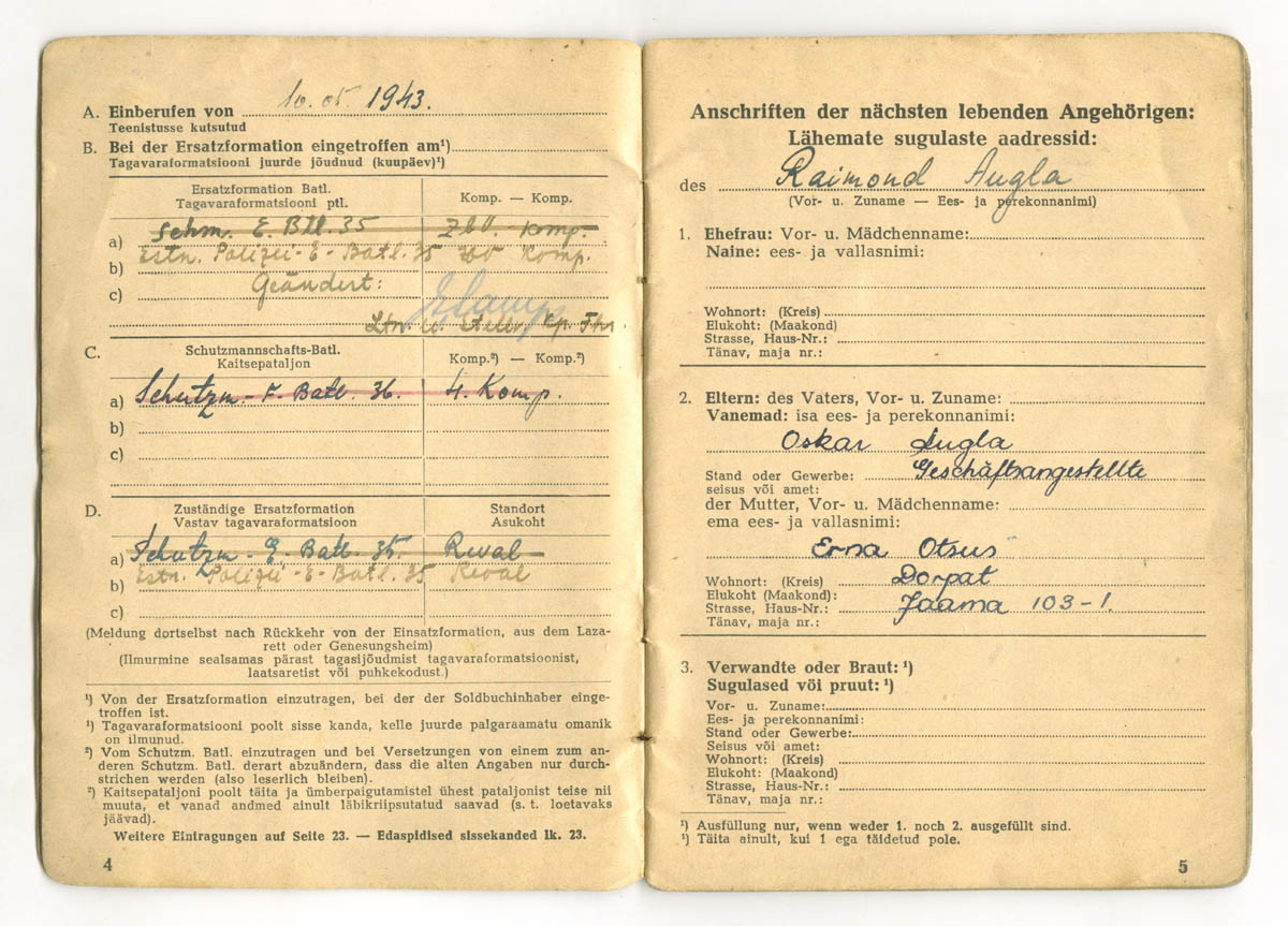 Vaatame lähemalt ühte Politseipataljoni võitleja palgaraamatut, mis on välja kirjutatud 36. Politseipataljoni Unterwachtmeister Raimond Auglale. Kahjuks on Augla üksusega liitunud alles 1943. aasta suvel ja seetõttu ei ole seal sissekandeid Stalingradi lahingute kohta, millest 36. Politseipataljon 1942. aastal osa võttis. Palgaraamatu 2. leheküljel on üksuse ülema, endise EW sõjaväe majori Heinrich Artur Kaschan'i allkiri.