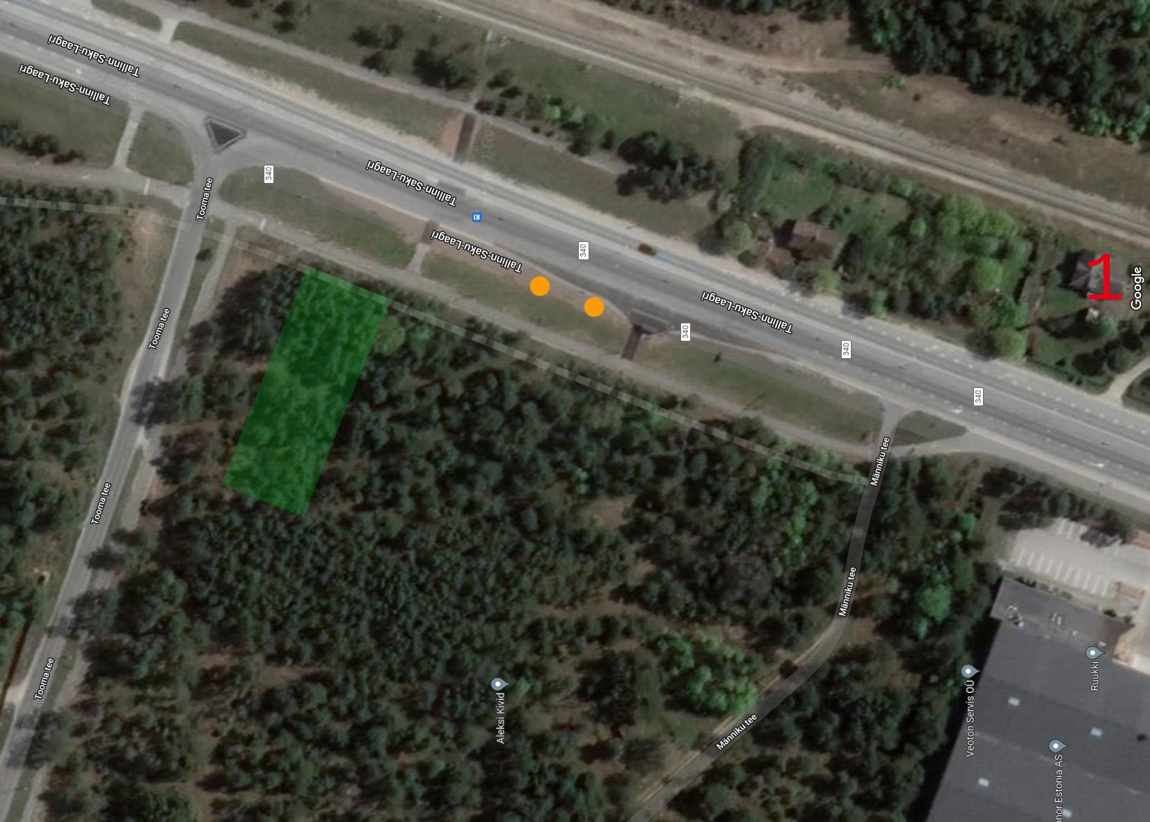 Aerofotole märkisin oranžide täppidega kotkastega väravapostide asukohad, nr. 1 on Männiku raudteejaama hoone ja täppidest vasakul olev roheline ristkülik on see huvipakkuv hoone.