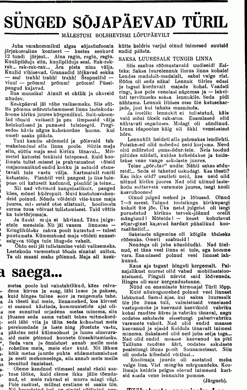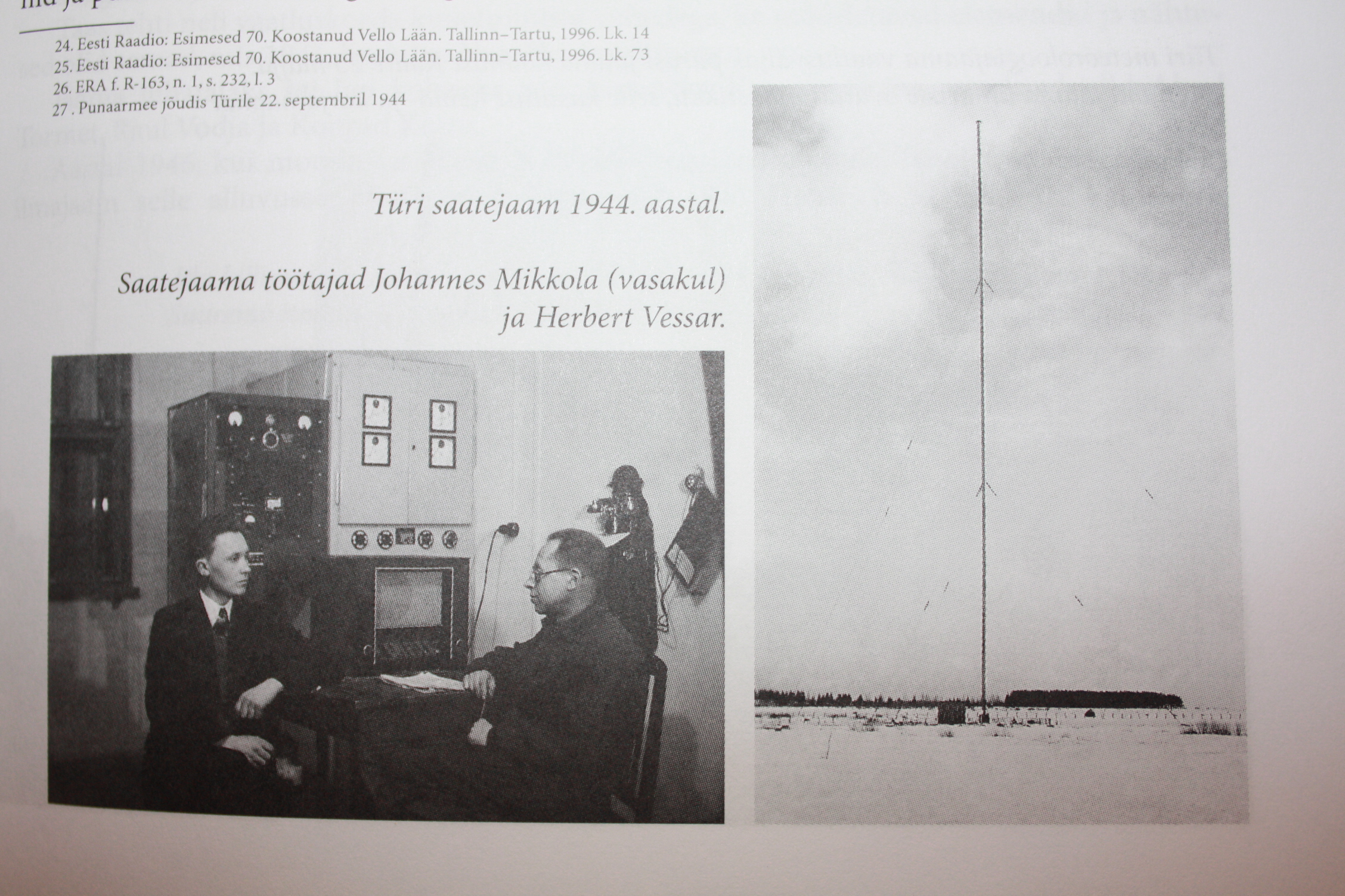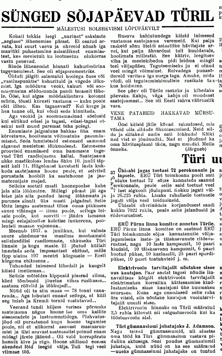 "/.../ Türi saatejaama ülem oli sakslane Schnellewald. Personali hulka kuulusid poliittöötajad Grabers ja Wunschkun, saatetehnikud Herbert Vessar, Voldemar Kivisepp ja Ants Kajandi, valveametnikus Arvi Sidron, Johannes Mikkola ja õpilane Järv/.../"