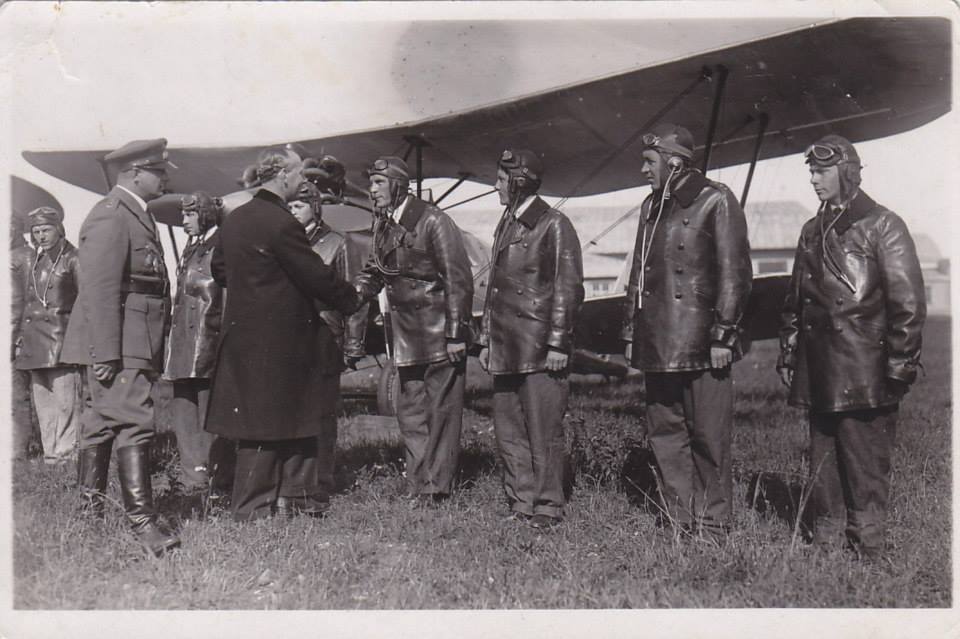 1932. a. lennuvõistlus. Riigivanem oli siis Einbund (kes sai Eenpaluks), tema selja taga seisab Tomberg. Einbund surub Anilinne kätt. Kõige lähem lendur on Olt, järgmine Braun, kolmandast ei saa aru, tagumistest rääkimata...