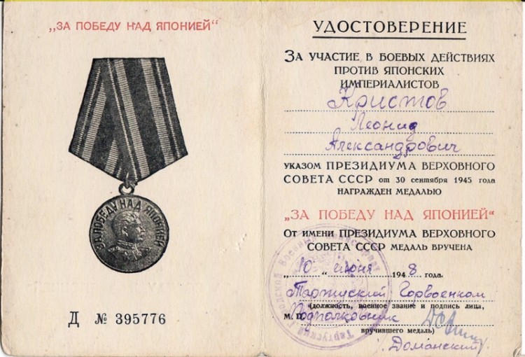 Tartus välja antud võidumedal Jaapani üle dokument.