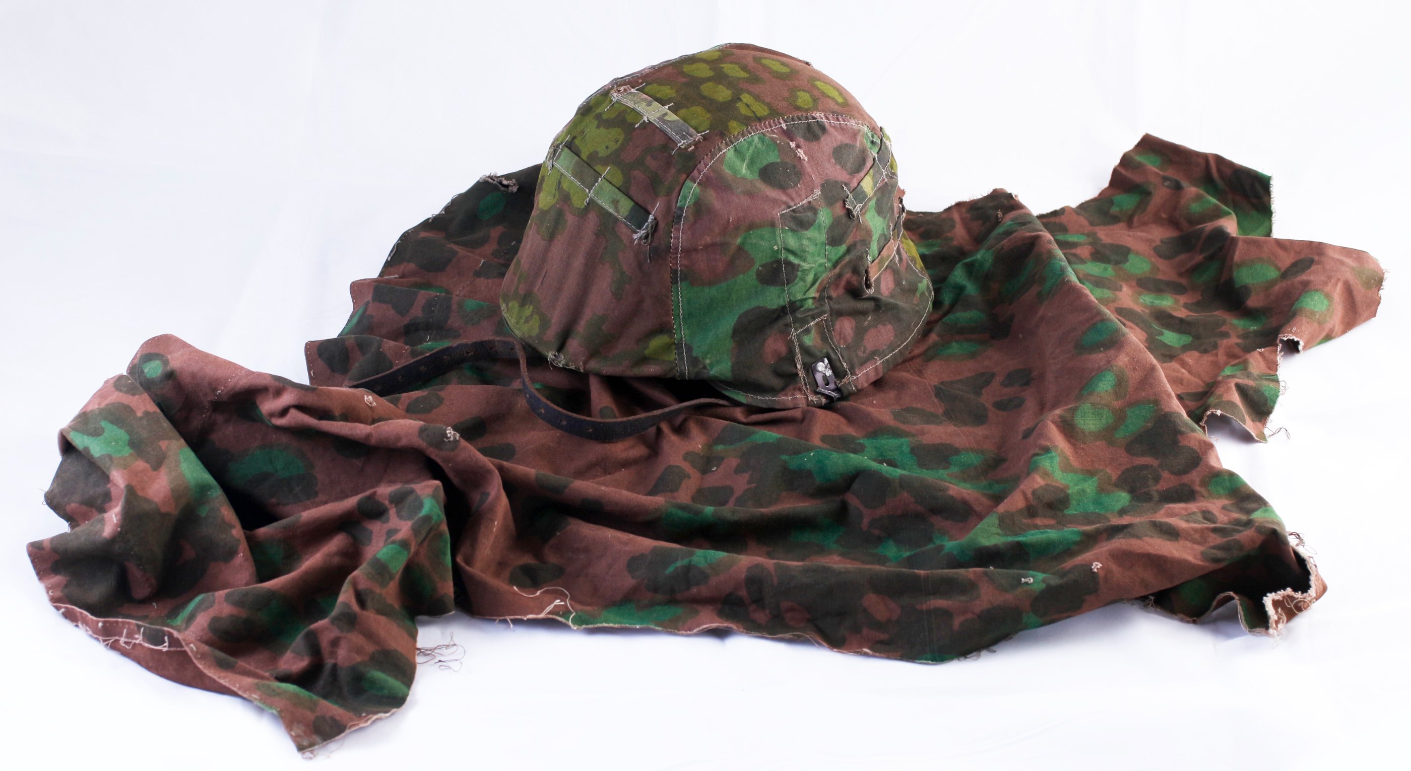 Mu kõige esimene tükk W-SS maskeerimisriiet, mis ma sain päris selle aastatuhande alguses - nii umbes 23-24 aastat tagasi. Leitud on see Raplamaalt ja lõigatud Platanenmuster Nr. 5 telkmantlist. Mulle on alati meeldinud selle konkreetse kanga rohelise värvi toon ja olen lootnud leida mingit riietuseset just sellisest kangast. Mõned aastad tagasi sain ühe väga ilusa Platanenmuster Nr. 3 telkmantli, kus on ka sarnast tumerohelist aga toon ei olnud ikka päris selline nagu sellel lõigatud tükil. Aga nüüd, paar päeva tagasi sain osta vinge kodumaist päritolu (leitud Amblast 2001. aastal) kiivrikatte, mille küljed on täpselt samasugusest kangast.