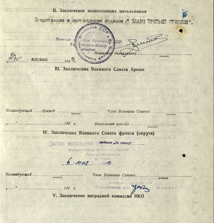 Teine vapruse medal 2402785 saadud vastuluureüksuse SMERSH käsutuses karistusüksuses olles ( ilmselt Kuramaal ), kus peeti erilist hoolt selle üle, et kõik kes peaks on ikka eesliinil ja täidavad oma lahinguülesandeid. Lühidalt siis midagi sellist. Tegelikult esitati ta viimase eest Punatähe ordenile, aga sai Vapruse medali.