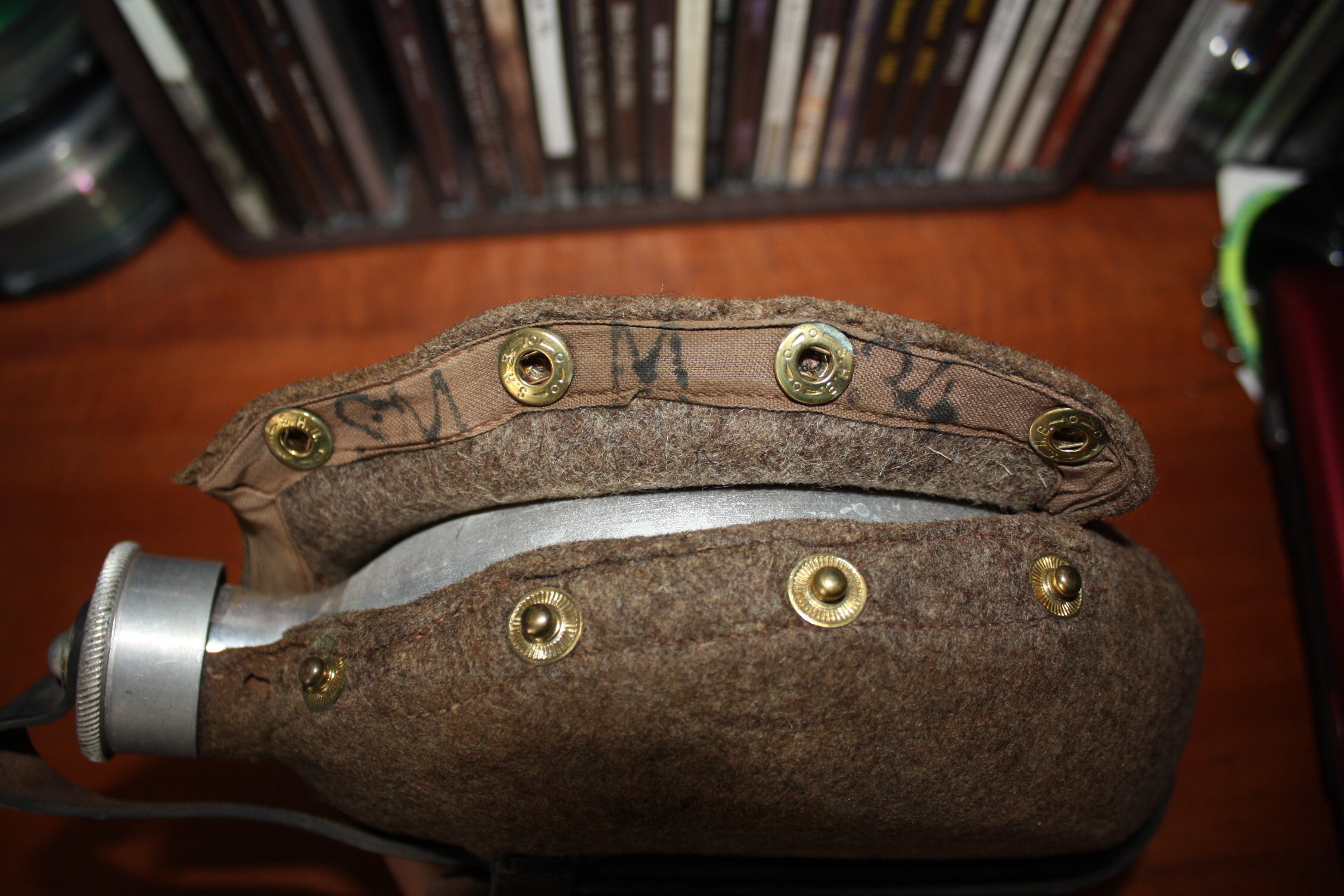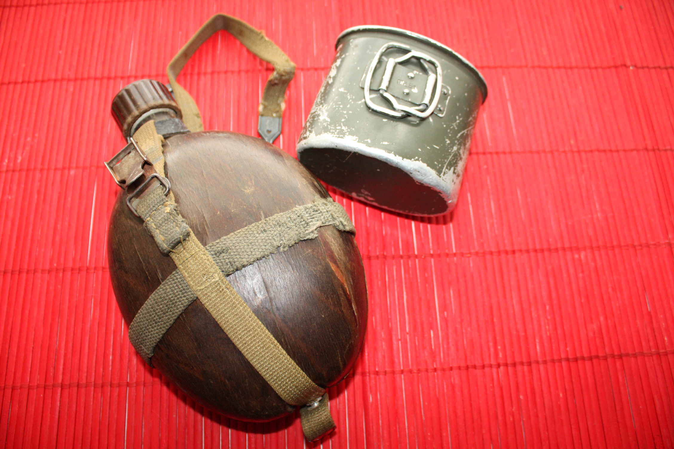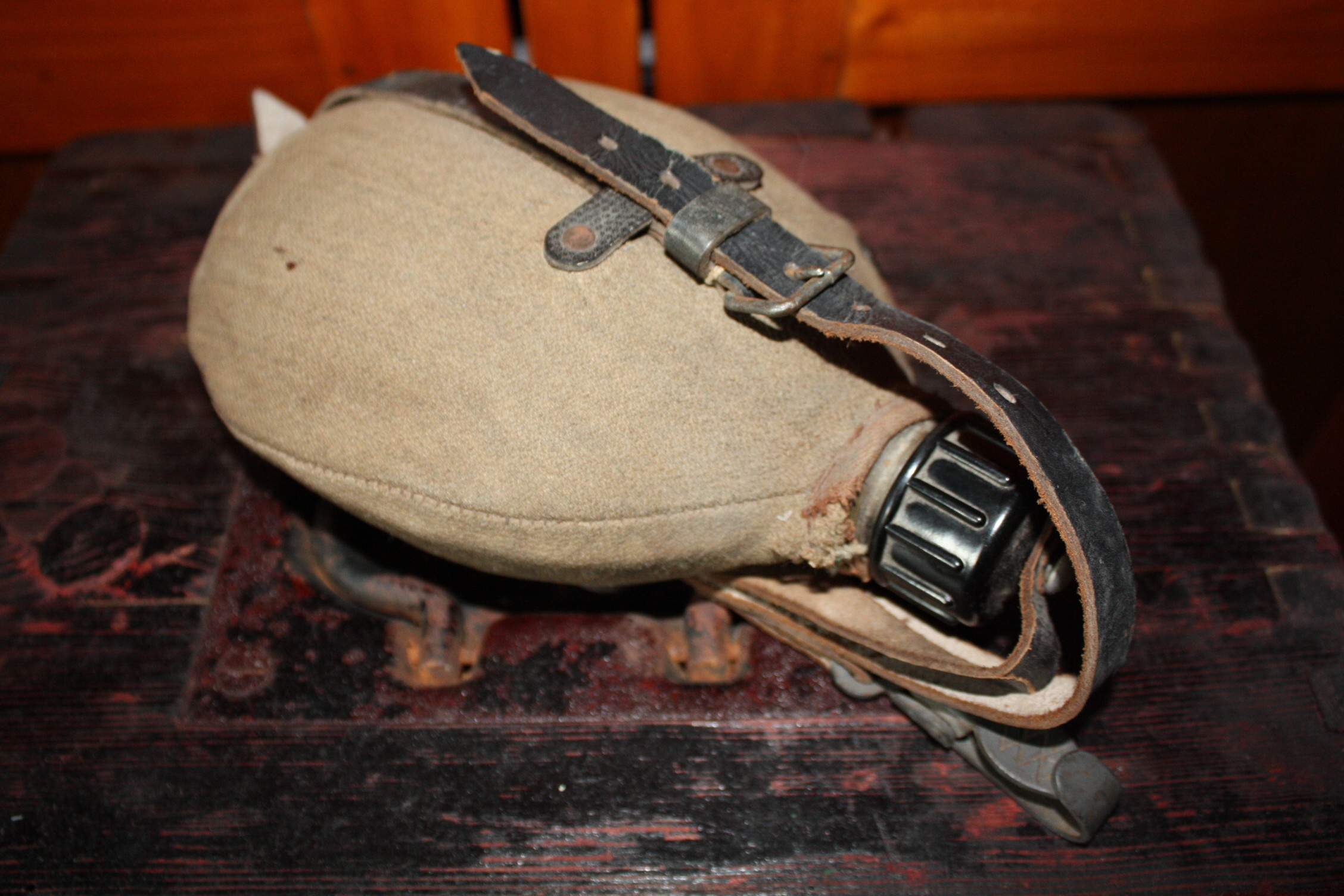 Ühe Eestimaa vanaisa kapist ilmus välja veel üks täiesti kasutamata troopikapudel. Markeeringud putlil ja topsil HRE42, rihmade metallosad ja minu kogus esmakordselt tembeldatud nahkrihm HRE43. Pudelilt pesin "paatina" maha, sest tundus ebahügieeniline teist puudutada, rihmad jätsin nii, nagu nad aastakümnete jooksul olnud on- pandlalt väike roostetriip ja joogitopsilt alumiiniumijälg tekstiilile külge hakanud. Asi tuli osta.ee-st, kesise majandusliku seisu tõttu panin automaatpakkumisse suht väikese numbri ja üllatusena keegi sellest üle ei pakkunudki. Et tegemist täiesti minty pudeliga, selgus alles siis, kui seda oma käes hoidsin.