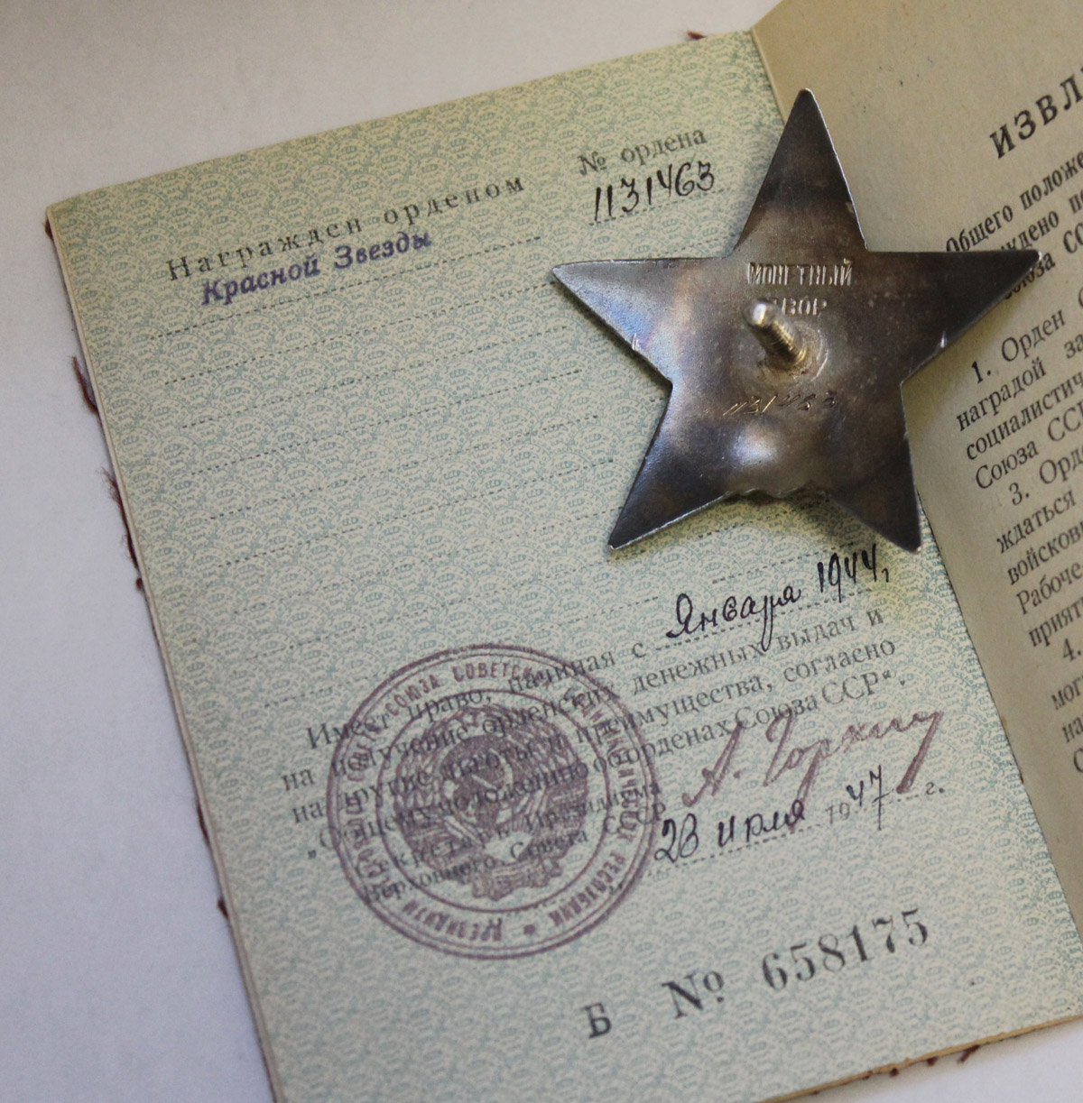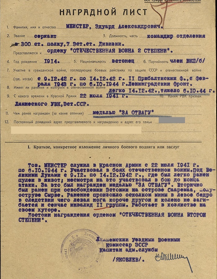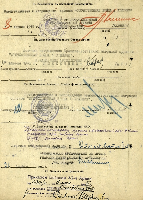 ...selle eest, et lahingus Velikei-Luki äärelinnas? "Valge maja" ründamisel 25.12.42 ilmutas äärmist mehisust ja vaprust. Hävitas vintpüssist 3 fašisti ja õhutas (tekitas?) midagi?? fašistide vastu teistes võitlejates??? (ei saa pihta, mis sõna seal on?) Rünnakule läks alati esimesena haarates endaga kaasa ülejäänud massi. "Valge maja" ründamisel sai raskesti haavata.....
