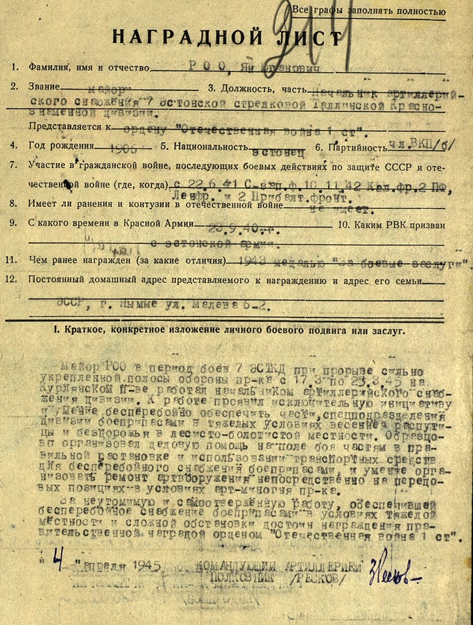 Suvi sai läbi ja hakkame aga vaikselt täiendama. Esimeseks major Roo, Punalipulise, Tallinna nime kandva 7. Eesti Laskurdiviisi suurtükiväe varustusosakonna ülem. Isamaasõja II klassi orden nr. 428629, autasustatud 1945 aastal lahingutegevuse eest Kuramaal.