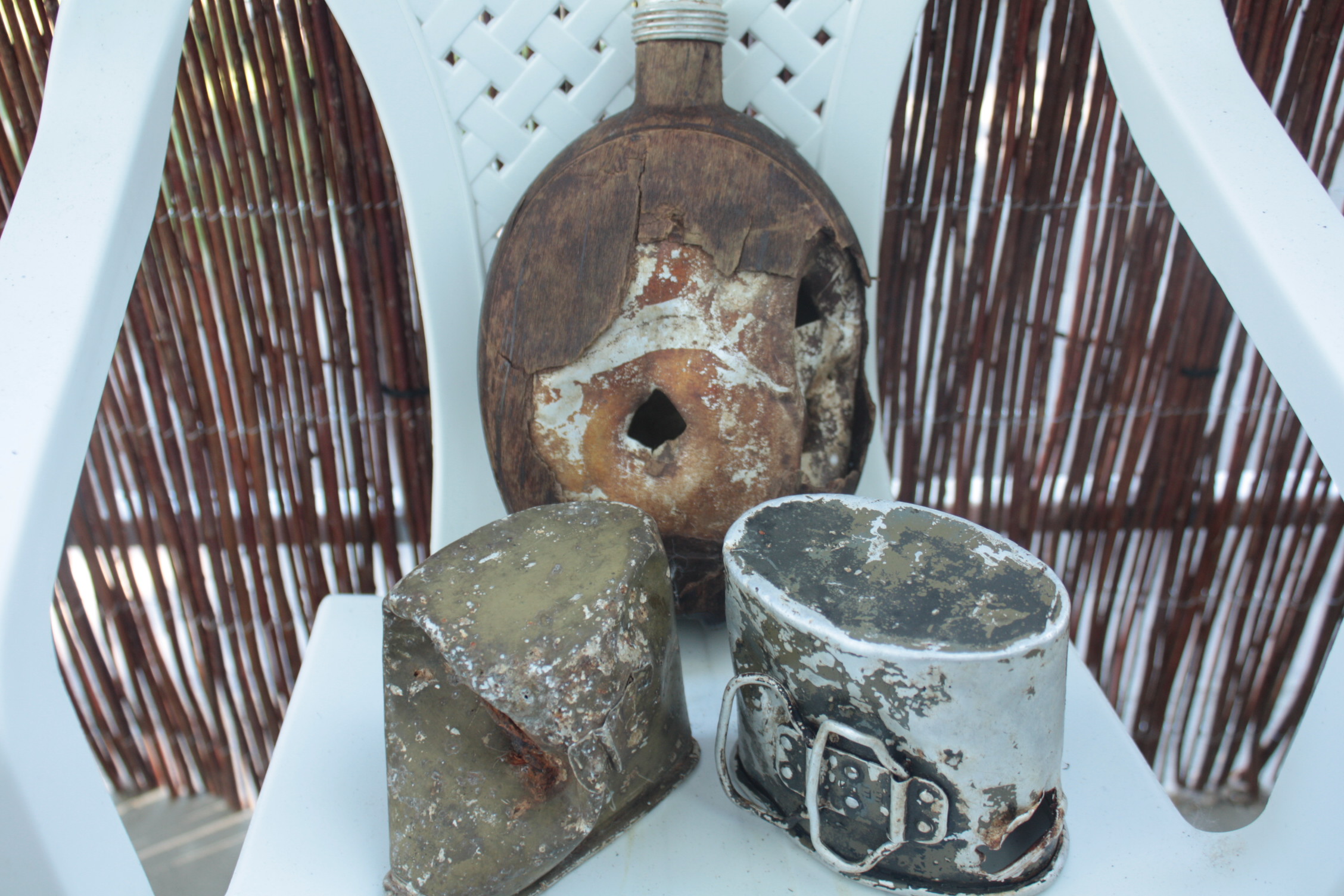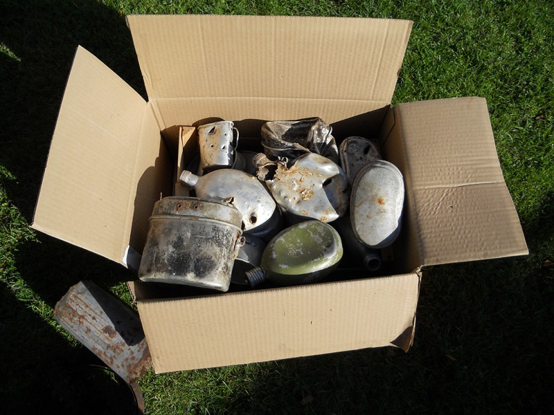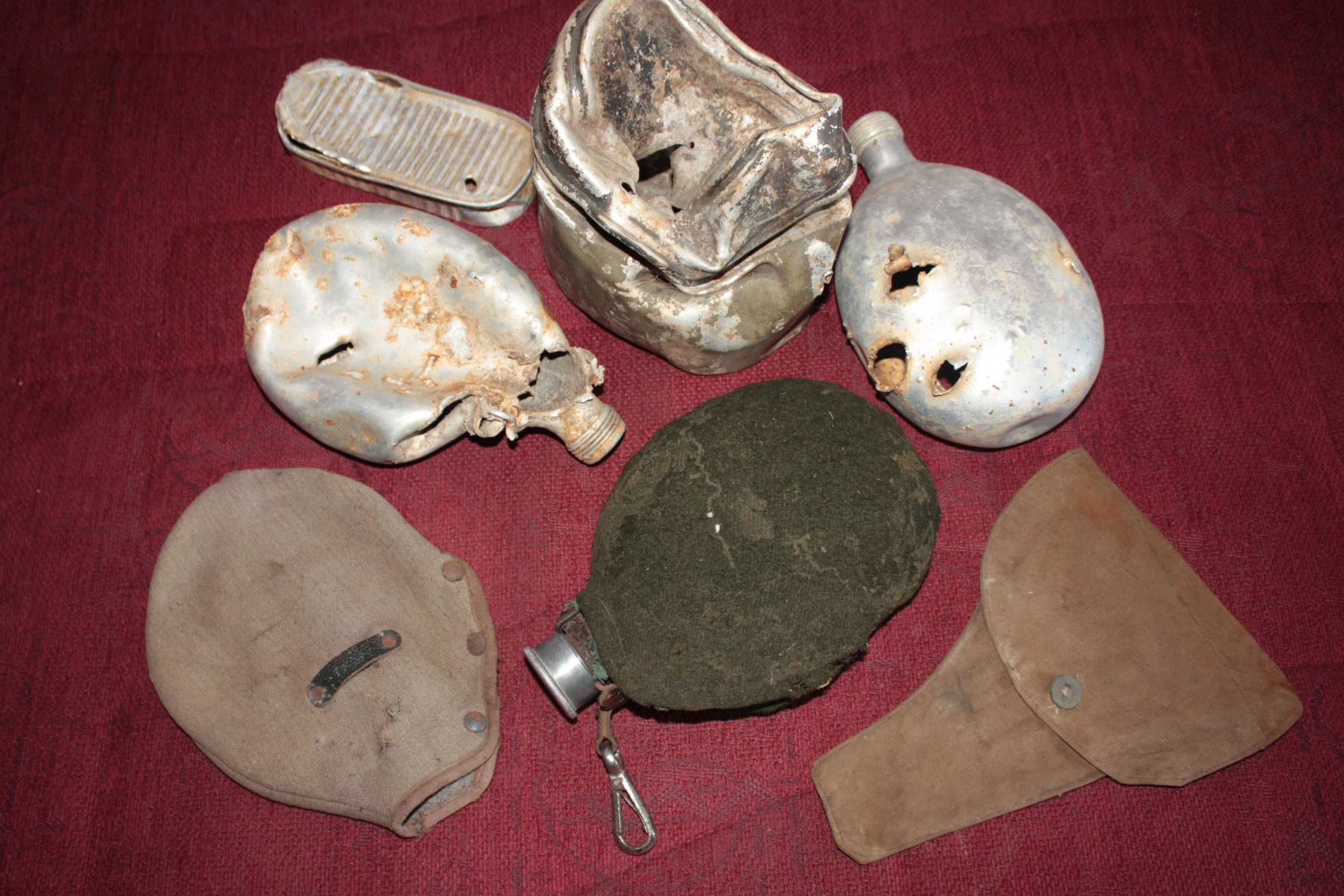 Oleksin tänamatu ja lausloll, kui tänase laadaga rahul poleks. Läksin ennekõike lahingus köndistatud joogitopside jahile ja ei pidanud pettuma. Lisaks üks katelokiräbal, agoonia-aegne pudeli ümbrisriie, ilmselt ainuke ja eestlasele nimega Martin Eeland kuulunud TAV-i välipudel (detailsemaid pilte siit: http://www.wehrmacht.pri.ee/foorum/phpB ... 9&start=15 ) ning Muhust terve pakina leitud kabuur, mis väidetavalt olla FN/Browningu oma I Ilmasõja päevilt (nööbil kiri Equipements Militaires; II MS aegne 9mm High-Power istub sisse küll, aga mitte väga valatult).
