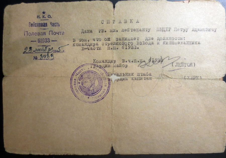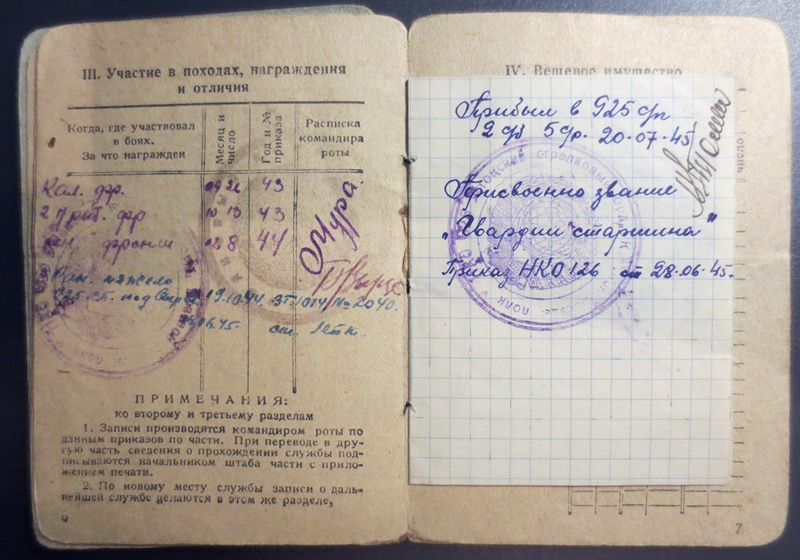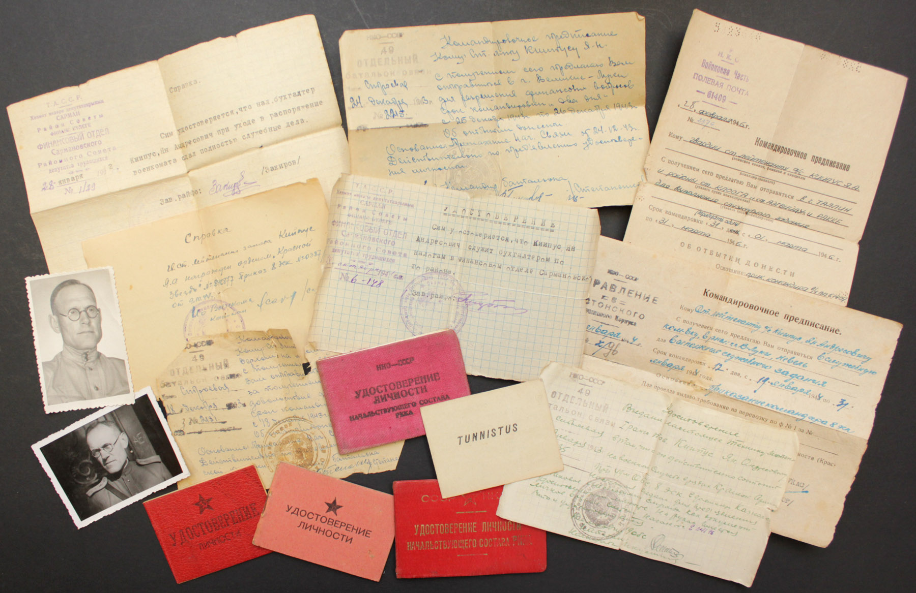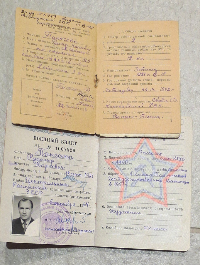 Paberite hulgas on ka sõjaaegne (esmane) Punatähe ordeni tunnistus. Temale antud ordeni number oli 846877 ja sama teema 12. leheküljel olen paar aastat tagasi näidanud leitnant Edgar Nittimi Punatähe ordenit, mis oli numbriga 846878. Kiipuse orden oli juba varem rändama läinud - ehk õnnestub see kunagi dokumendiga jälle kokku viia.