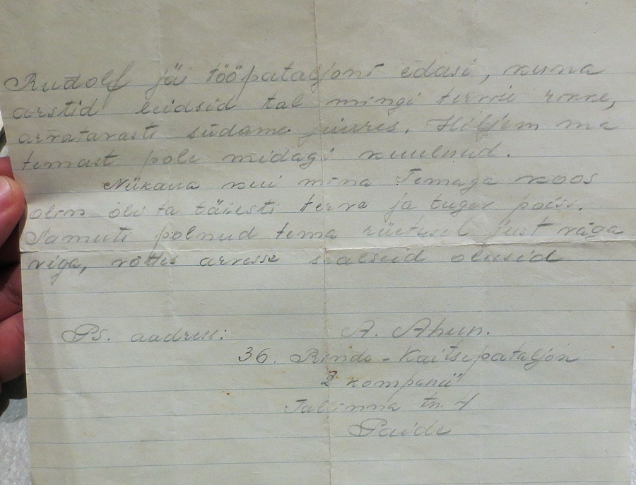 Kirjade hulgas oli ka 1943. aastal 36. Rinde-Kaitsepataljonist Pangsepa lähedastele saadetud kiri, milles püütakse peret informeerida Pangsepa saatuse kohta. Seda teeb keegi A.Ahun, kes oli Pangsepaga tööpataljonis koos. Ilmselt siis millalgi vahetas poolt ja oli hiljem 36. Rinde-kaitsepataljoni 2. kompanii võitleja.