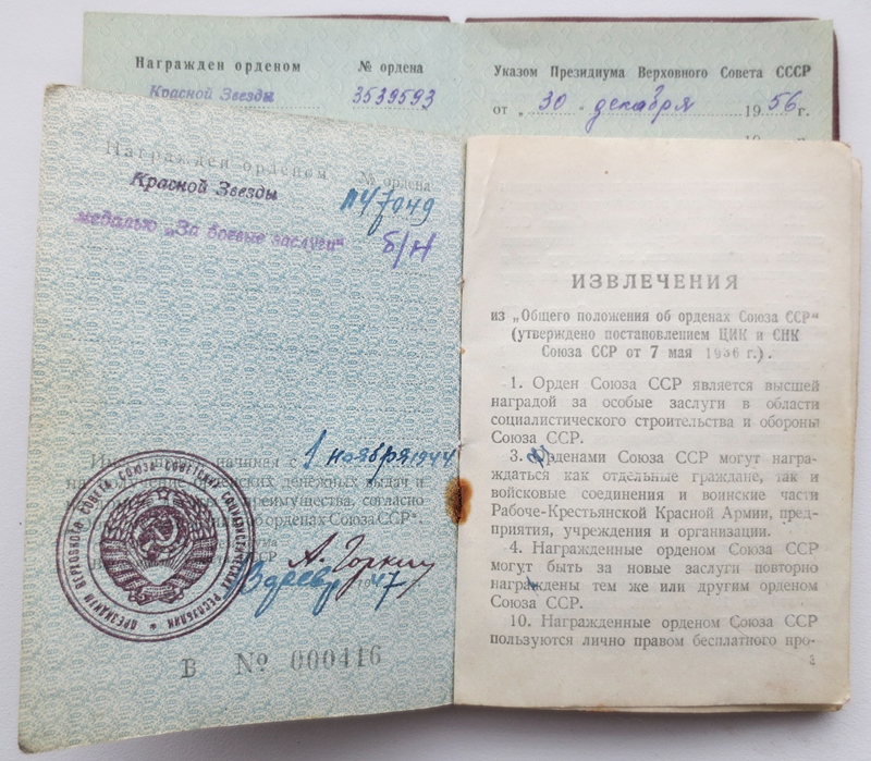 Esimene Punatähe orden (1147049) on saadud Väikese väina forsseerimise eest, teine Punatäht ja Lahinguteenete medal arvatavasti Punaarmees väljateenitud aastate eest.