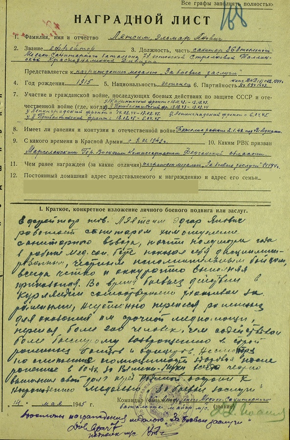 7. Laskurdiviis, 86. Üksik meditsiinipataljon, jefreitor Elmar Lätsim. Kahe Lahinguteenete medali kavaler ( millest viimane on kahjuks kadunud ). Teekond standartne Velikije- Luki- Kuramaa. Ja kõik see muu, mis sinna vahele mahtus.