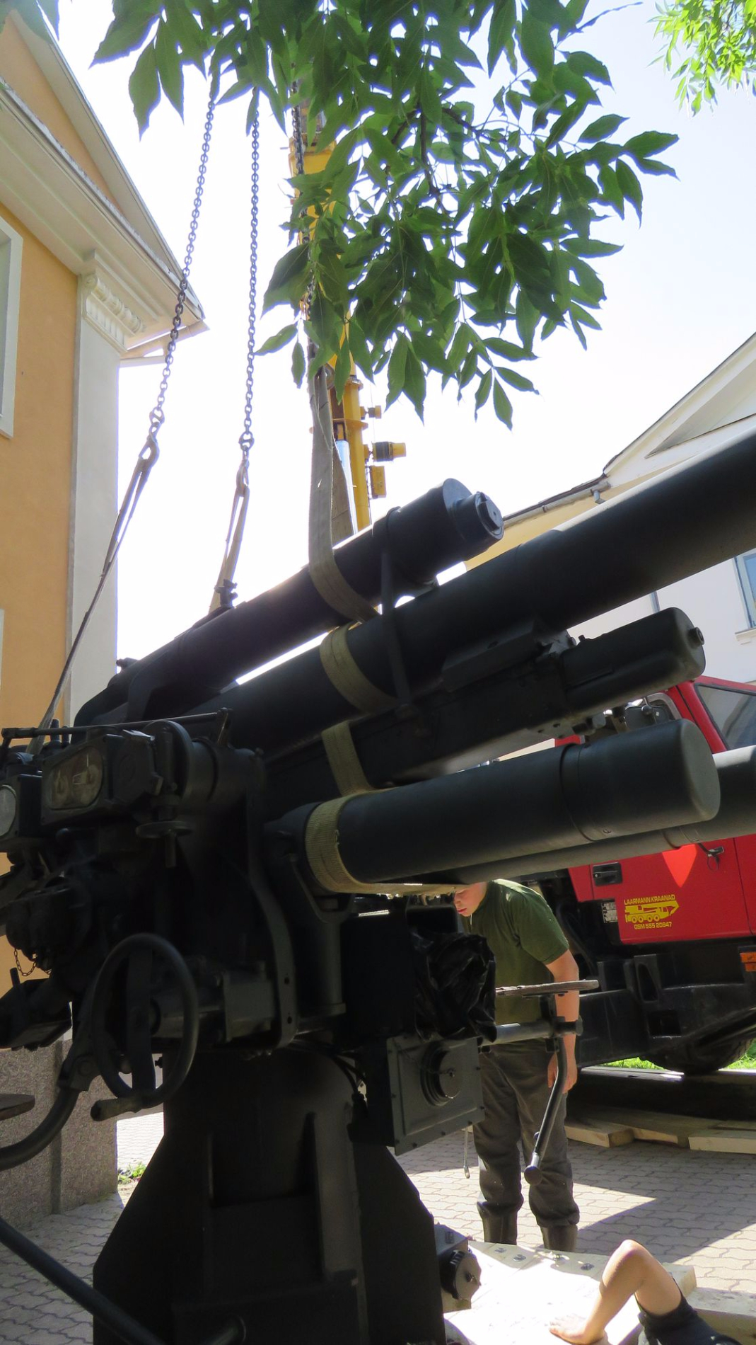 Pärnus Võimlemise ja Ringi tänava nurgal Leo Tammiksaare eestvedamisel töötava Eesti SS-leegioni muuseumi katusel ja õuel seisvad kaks teise maailmasõja aegset Saksa armee kahurit tõstetakse kraanaga veoautodele ja sõidutatakse mujale.