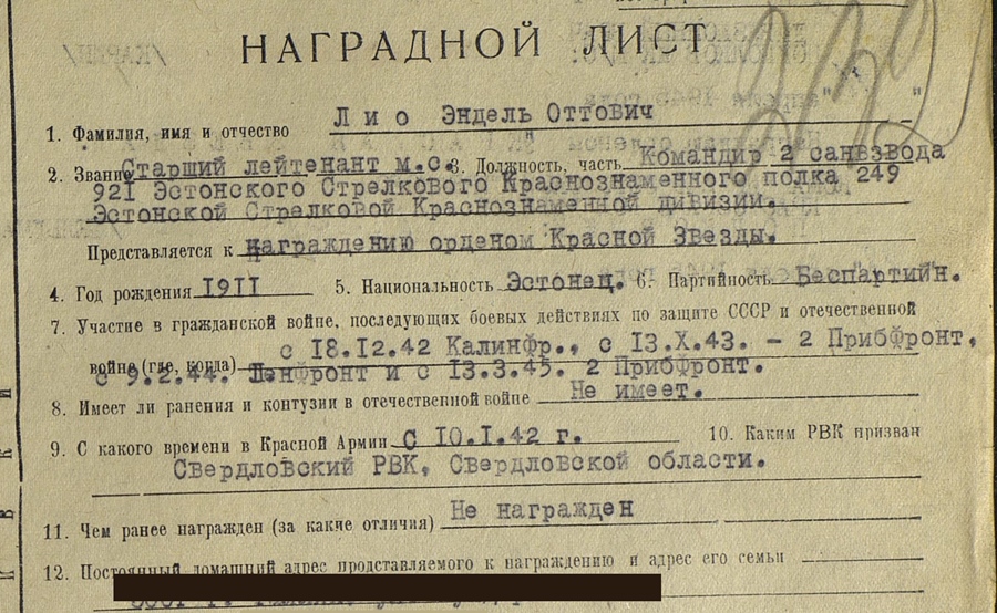 921 LP meditsiiniteenistuse vanemleitnant Endel Lio. Punatäht 2121639 on saadud Kuramaa lahingutes. Üsna lähedane number eelmise postituse Punatähele.