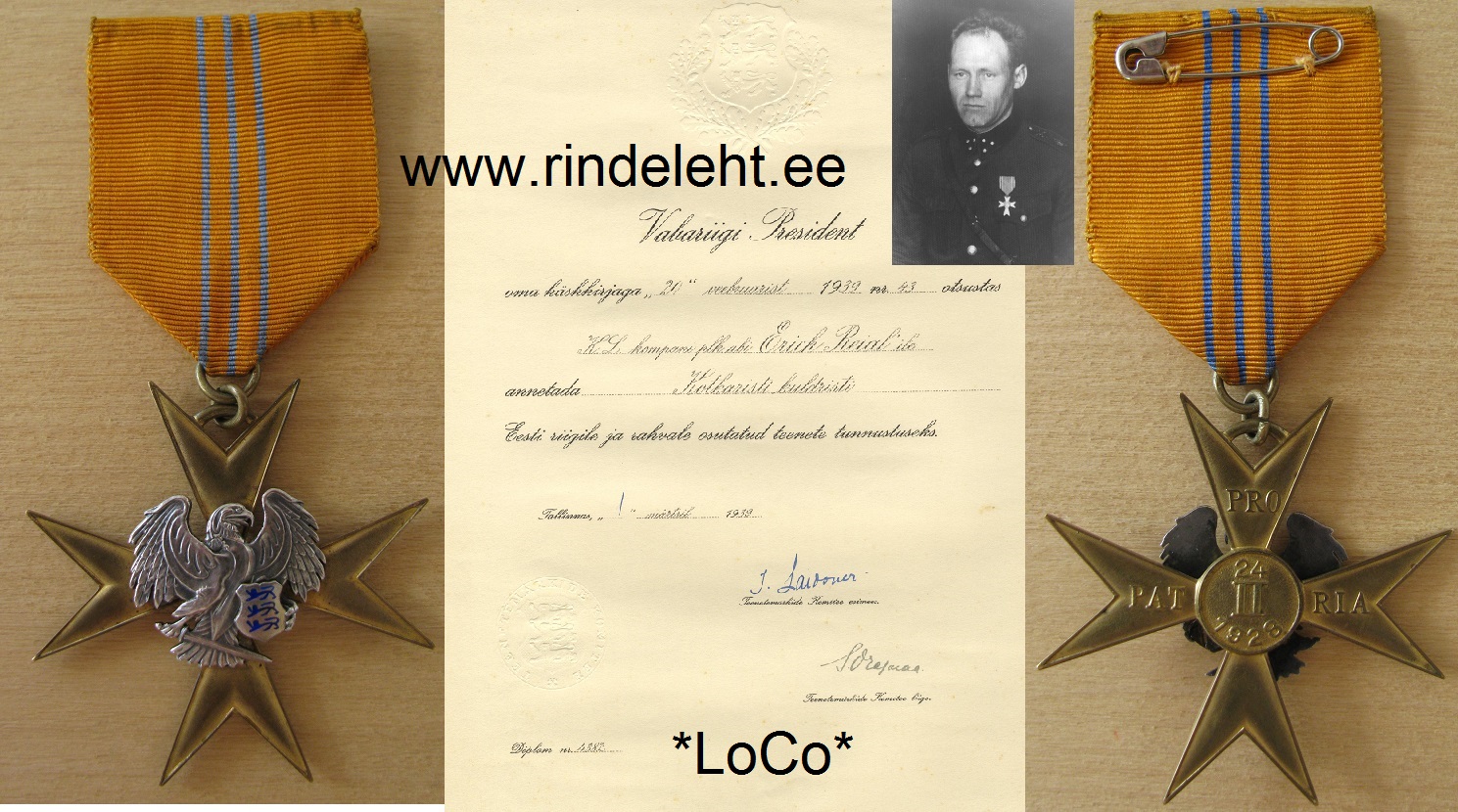 KL Tartumaa maleva Torma malevkonna Torma kompanii pealiku abile allohvitser Erich Reialile annetatud Kotkaristi teenetemärgi kuldrist. Tunnistus on koos orig. vutlariga. Erich Reial tapeti vist punaste poolt 1941. a juulis.