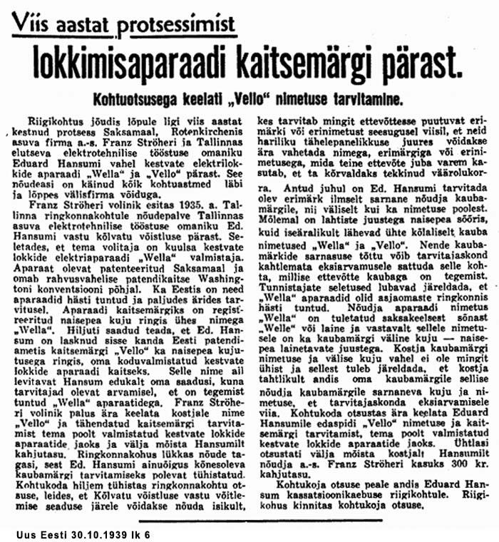 Mõnes teises juuksetööstuses võis lasta endale ka "Vello lokke" teha, mis aga Wella-tegelastele üldse ei meeldinud ja 1939 lõpetati see nali ära. Hansum võttis kasutusele "Ilu" kaubamärgi, kuid "naisepea kujutuse ringis" vastu ei jõudnud sakslased vist enam uut protsessi algatada.