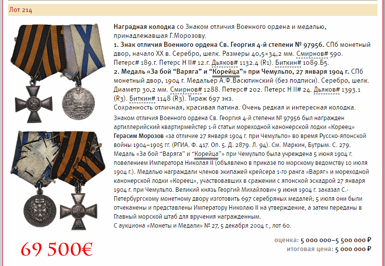 Lisan ühe pildi 2015. aasta müügist, kus läks kaubaks samasugune komplekt (merelahingu medal + sama lahingu eest antud Georgi rist), müügihind oli 5 miljonit rubla, mis tänase päeva rubla kurssi arvestades oleks 69 500€ (2015. aastal oli rubla kurss vist isegi natuke tugevam ja seega hind tuleks üle 70 000€).