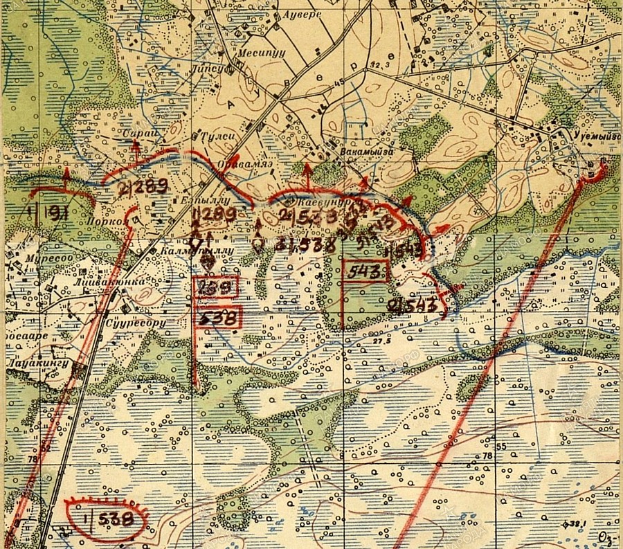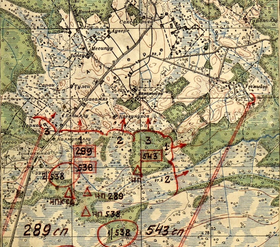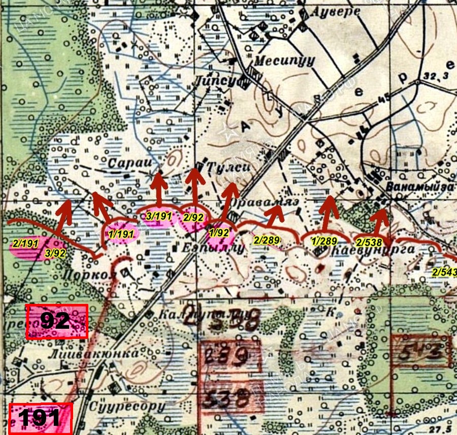 Maaalalist edu saavutanud pataljon 2/289. kaevus Tulsi talust ida suunal ja 1/543. Vanamõisast lõunasse suunduva tee idaküljel.