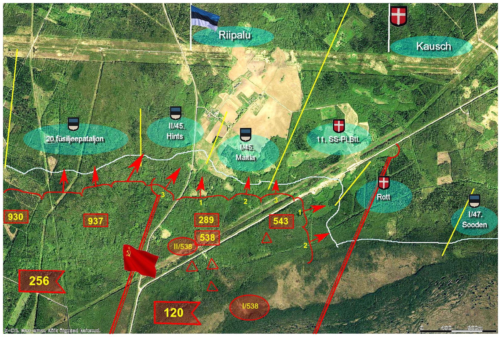 Vangivõetud 45. Rügemendi sõduri jutu järgi on vastas eestlaste jalaväe- ja saksa suurtükiväeüksused.