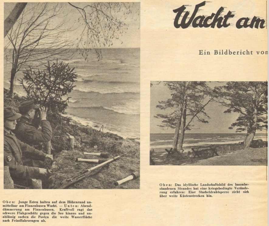 Posten halten Wacht am finnischen Meerbusen. Über die weite Wasserfläche des Finnenbusens gleitet der Blick der Posten an der Schweren Flakgeschützen, die hier zum Schutze der Küste eingesetzt und berufen sind, jeden feindlichen Annäherungsversuch mit der kraft ihrer Waffe vernichtend abzuschlagen. PK-Reimers - 2139 Orbis E. M.