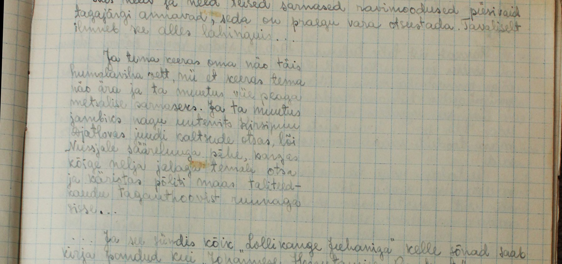 ... Oli hirmsat ootamist ja lootmist. Kuulujutud, et komisjon tulemas olid ammu juba siin. Ka võis seda välja lugeda ajalehtedest, kus olid toodud k.kom. Litzmanni ja dr. Mäe kõned. Aga meie S.S. ülemad ei tahtnud meid ära lasta. Muudkui lubasid aga saapaid ja riideid! ...