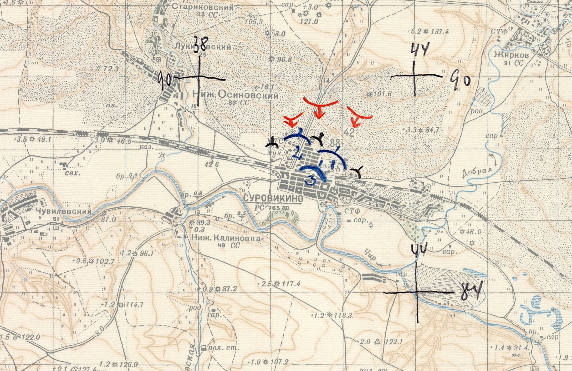22. novembri hommikupoolel jõudis pataljon raudteel eshelonina Surovikino raudteejaama. Meeskond kasutas esialgset peatumist kohvijoomiseks ja pesemiseks. Mäletan, et pesin vedurite veevõtmise pumba all ja ajasin habet. Pesemine ja raseerimine värskendas. Hommikul kusagil eelmises jaamas saime kuulda, et venelastel on õnnestunud välja tungida Morosovskaja-Stalingradi raudteeni. Kui rong Surovikinos peatus, sattusime venelaste raskemiinipildujate tule alla. Osa miine lõhkes üsna rongi lähedal. Laadisime kiiresti maha, jätsime pakid jaama kaubaaita ja asusime kohe positsioonile, üldsuunaga Surovikinost põhja. 2. kompanii pidi alul asuma patareide kaitseks, nende ette positsioonile. Hiljem see käsk muudeti. Kella 14.00 paiku hakkasime Surovikino alevikust välja liikuma. Osa sakslasi oli tulevahetuses bolshevikkudega. Jõudsime umbes 2 km kaugusele alevikust, kus asusime positsioonile ja oma tulega surusime vastase tagasi. Vastane tõmbuski meist eemale. Juba esimeste laskude juures sai raskelt haavata ülemleitnant Eduard Väärsi (hiljem amputeeriti jalg).