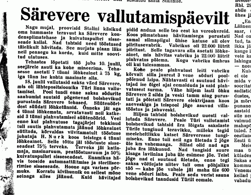 Särevere tehast sunniti tööd lõpetama 10. juulil ja asuti kohe ettevõtet mineerima. Eri kohtadesse masinate alla paigutati seitse tünni lõhkeainet. 18. juulil algas lahing Särevere pärast. Need sündmused on hästi meeles Lembit Vabaril. Kella kahe paiku päeval lasti tehas õhku. Õnneks jäi neli tünni lõhkeainet lõhkemata. Arvatavasti katkesid kolme tünni plahvatamisel teiste süütenöörid.