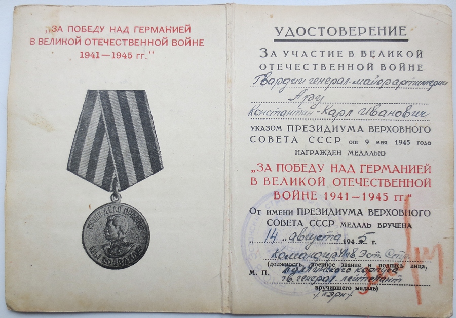 ''Võit saksamaa üle'' medali dokument. Medaliga on autasustatud suurtükiväe kindralmajor Karl Aru, dokumendile on alla kirjutanud 41. Kaardiväe Eesti Tallinna Laskurkorpuse komandör kaardiväe kindralmajor Lembit Pärn.