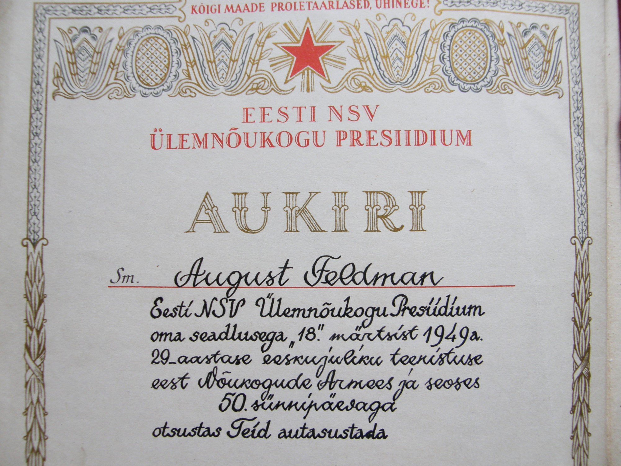 ENSV ülemnõukogu presiidiumi aukiri esimesele eestlasest sõjakomissarile 1951