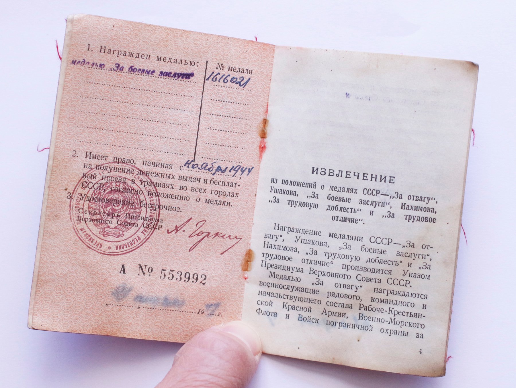 Medal lahinguliste teenete eest (1616021) antud 20.09.1944 Kõveriku lahingus side korraldamise eest.