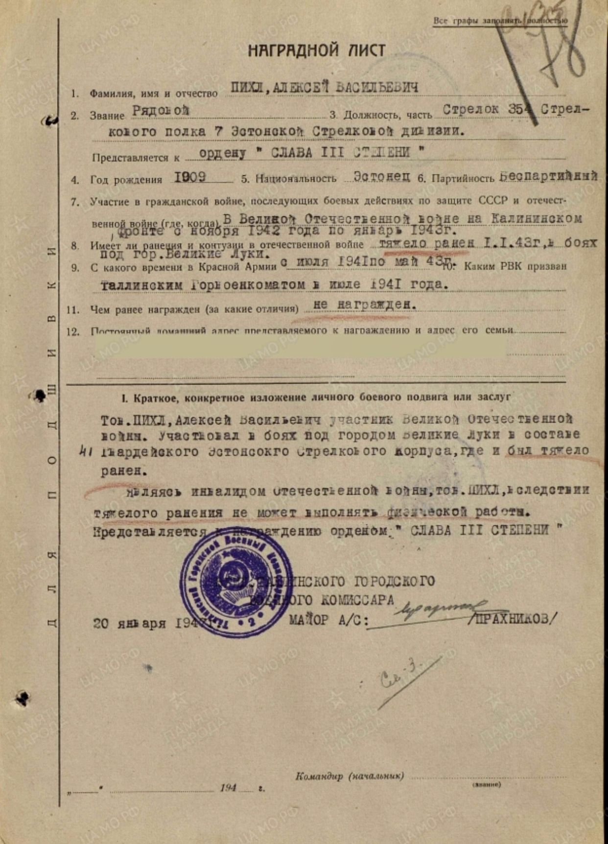 Oli oksjonil, Kuulsuse orden III klass 568836. Reamees Aleksei Pihl 354. LP/ 7. LD. Antud raske haavatasaamise eest Velikije- Luki all.