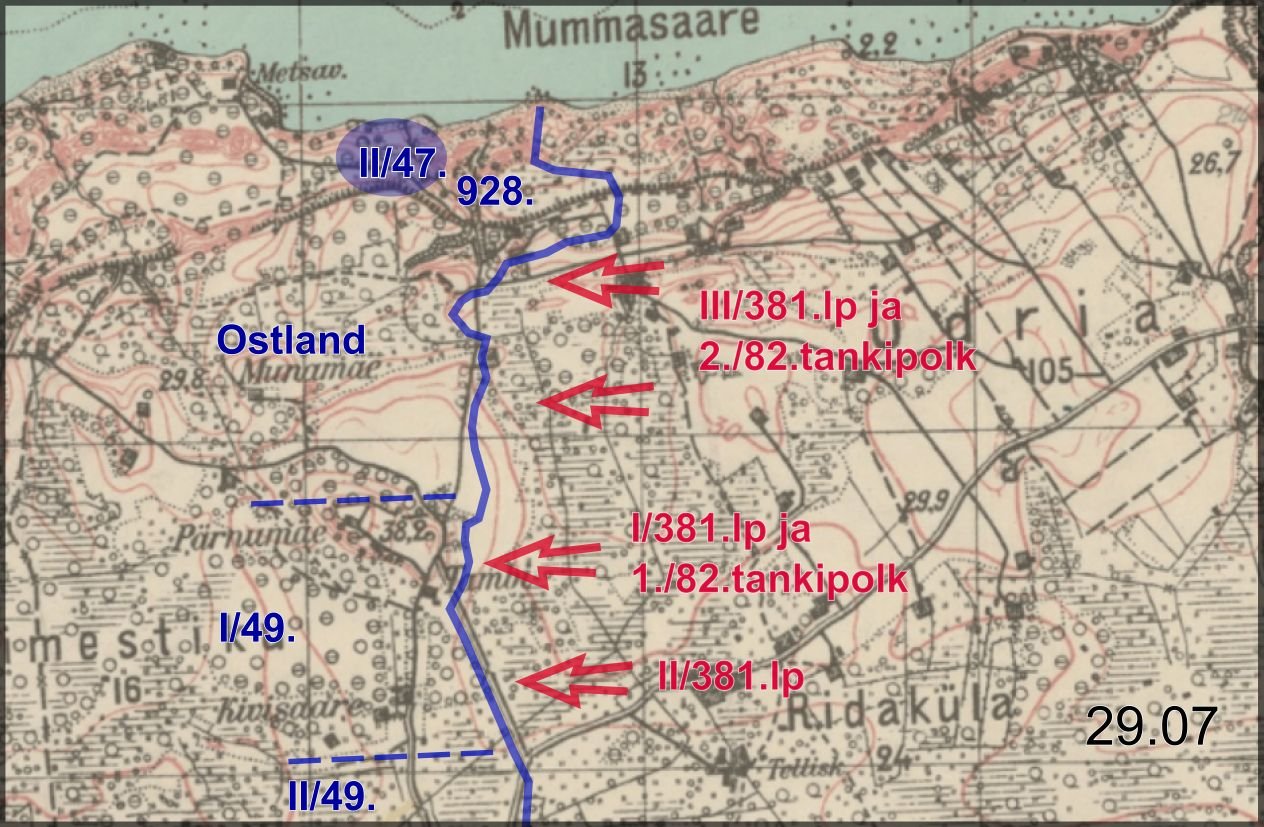 12.40 vastane koondus 500-600 m peavõitlusliini ees ja paremal rannikutee ees.
