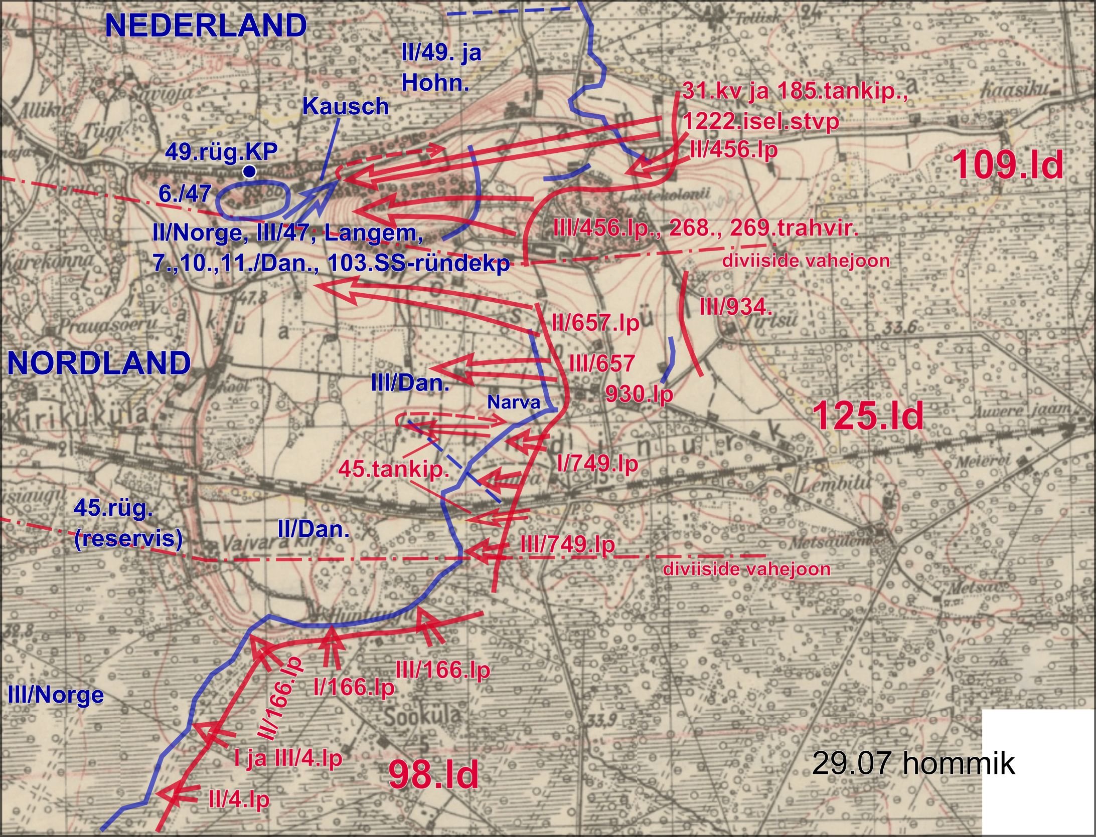 Rindel põhjast lõunasse endiselt: I/49 ülema Meyeri grupp (928. maaväe suurtükiväedivisjoni lahingpataljon, Mereväe lahingpataljon Ostland, I/49) ja 49. rügemendi ülema Collani grupp (II/49 ja Hohnschildi grupp). I/49 või II/49 või mõlema käsutuses endiselt ka 20. eesti diviisi võitlejatest moodustatud väiksem(ad) allüksus(ed).