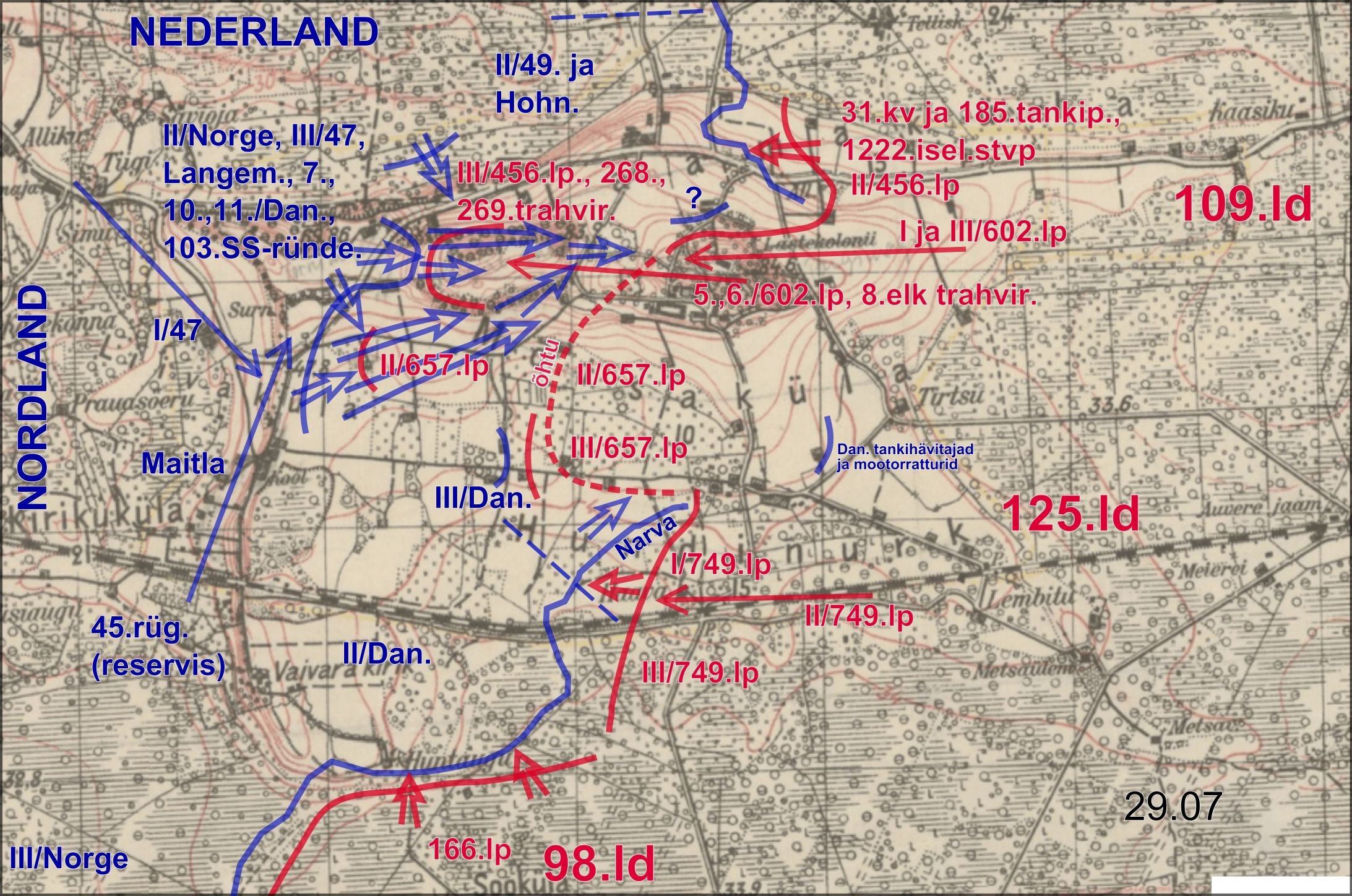 Nordlandi rinne oli endiselt jagatud kahe rügemendi – Norge ja Danmark – vastutusalaks. Olukorrakaartide põhjal oli 27.07 seisuga Norge käsutuses ainult selle III pataljon Sookülast läänes, aga 31.07 seisuga olid Norgele allutatud ka II ja III Danmark. Pole täpselt teada, millisel kuupäeval Danmarki pataljonid Norge alluvusse anti.