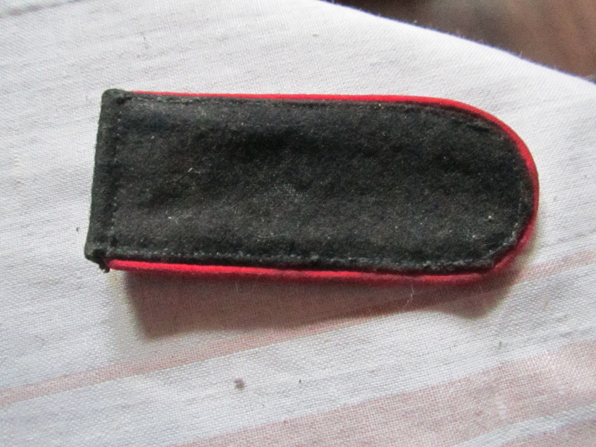 T eine pagun 13cm. pikk,laius4,5cm. Ümbritsetud punasese randiga, ümber (paguni peal)jookseb1cm.laiune kuldne põimitud lint ja paguni keskel on kuldne punutud kitsas triip mustal pinnal.