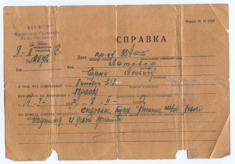 Haavata sai Velikije Luki all, mille kohta on olemas ka dokumendid ja haavatulint, mis õmmeldi vasaku rinnatasku kohale (näha viimasel pildil).