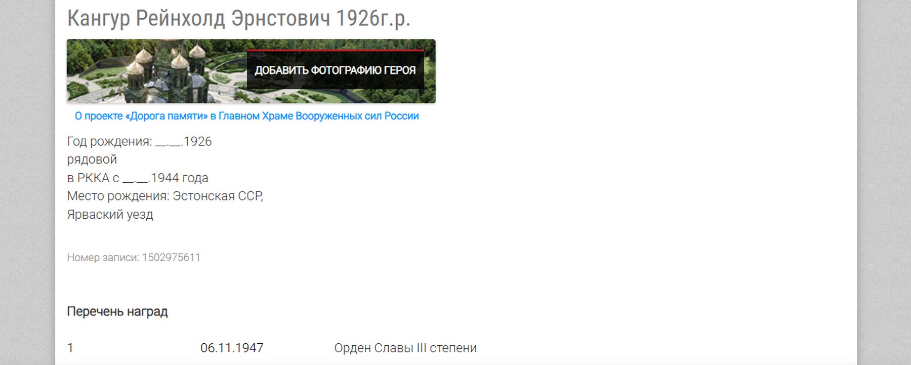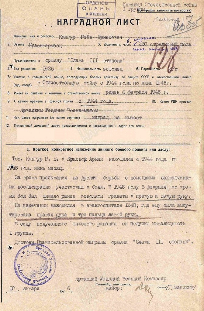 Ma arvan, et tegemist on selle mehega. 220. laskurpolgu laskur. Punaarmees 1944. aastast, osales mitmel korral lahingutegevuses, sai 1945. aasta veebruaris granaadikildudest paremasse ja vasakusse kätte raskelt haavata. Pärast seda haiglas, amputeeriti parem käsi ja vasaku käe kolm sõrme.uscha kirjutas: ↑N Apr 24, 2025 10:50 am Kuulsuse ordeni III järk (568808) - autasustatuks 1926. aastal sündinud ja 1944. aastal Punaarmeesse võetud reamees Reinhold Kangur. Autasu annetatud 1947. aastal aga see on ka kahjuks kõik, mis Podvig Naroda välja annab. Mingeid täpsemaid dokumente seal tema kohta ei ole.