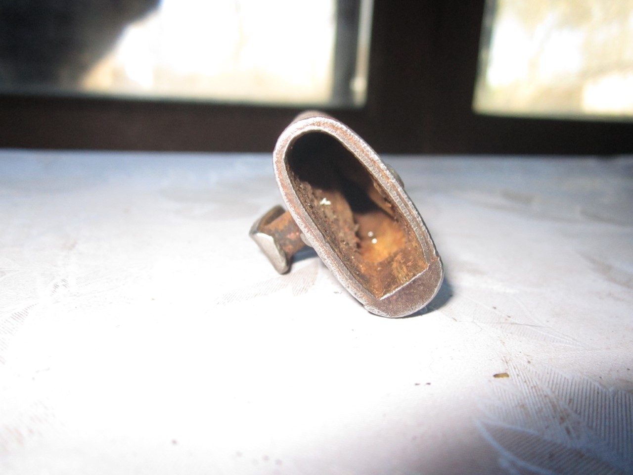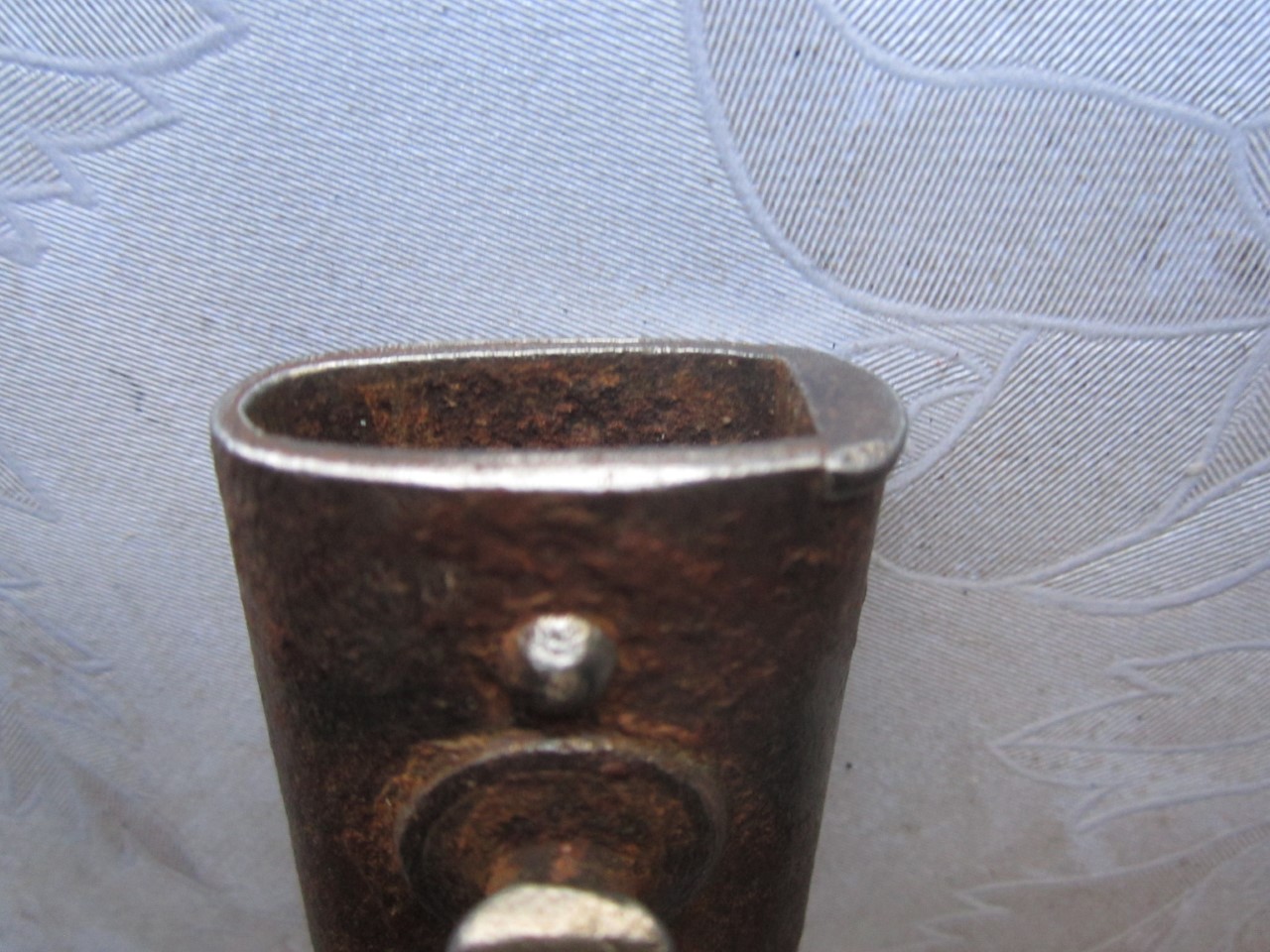 Selline tupe-pikkus 17cm.Noa tera laius mis läheb 2,5cm. Sees fiksaatorid korras.Fiksaatorid needitud . Kahest osast kokku joodetud vasega. Ei ole talumehe töö. Kes teab ?