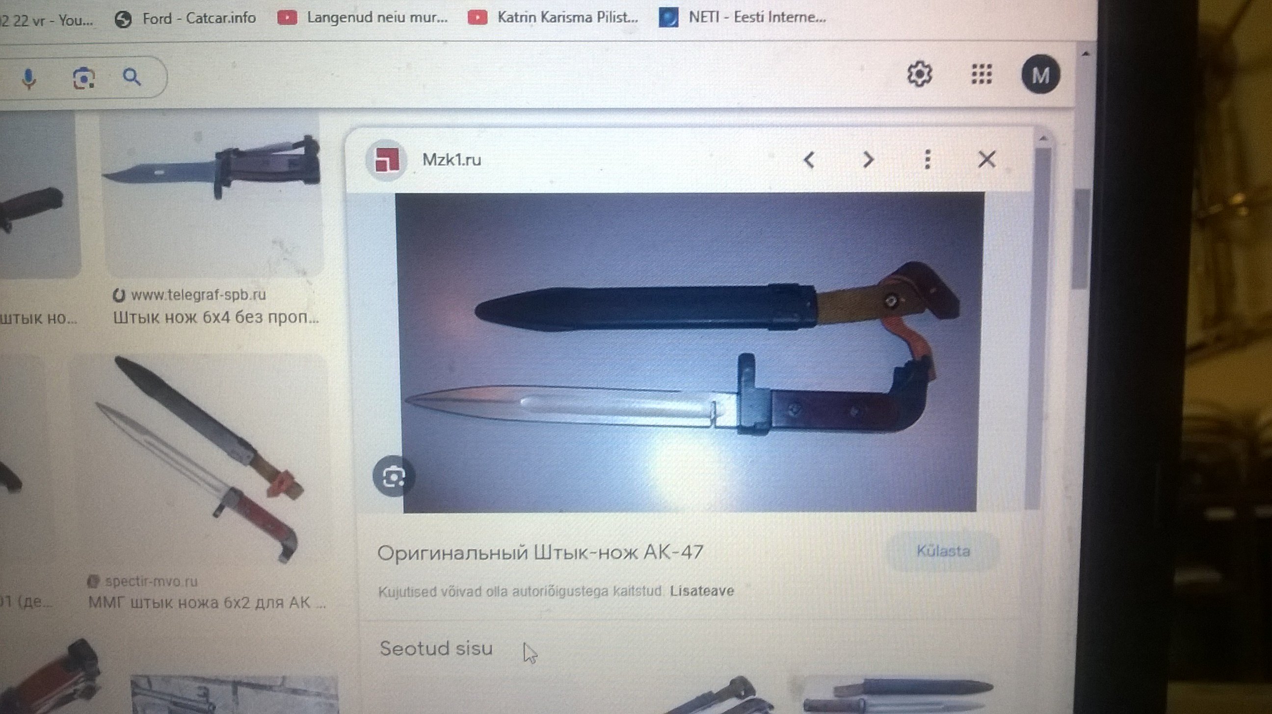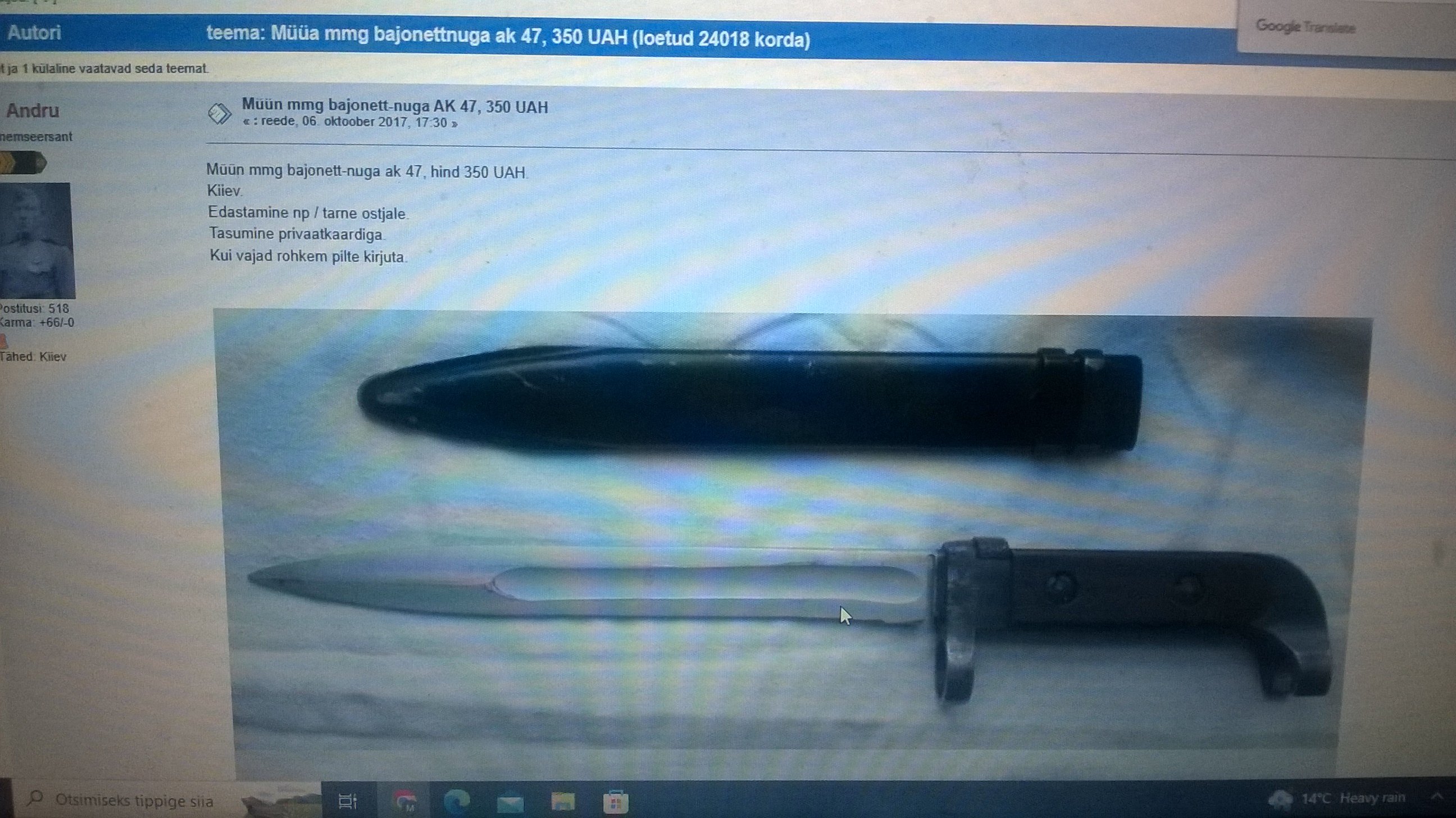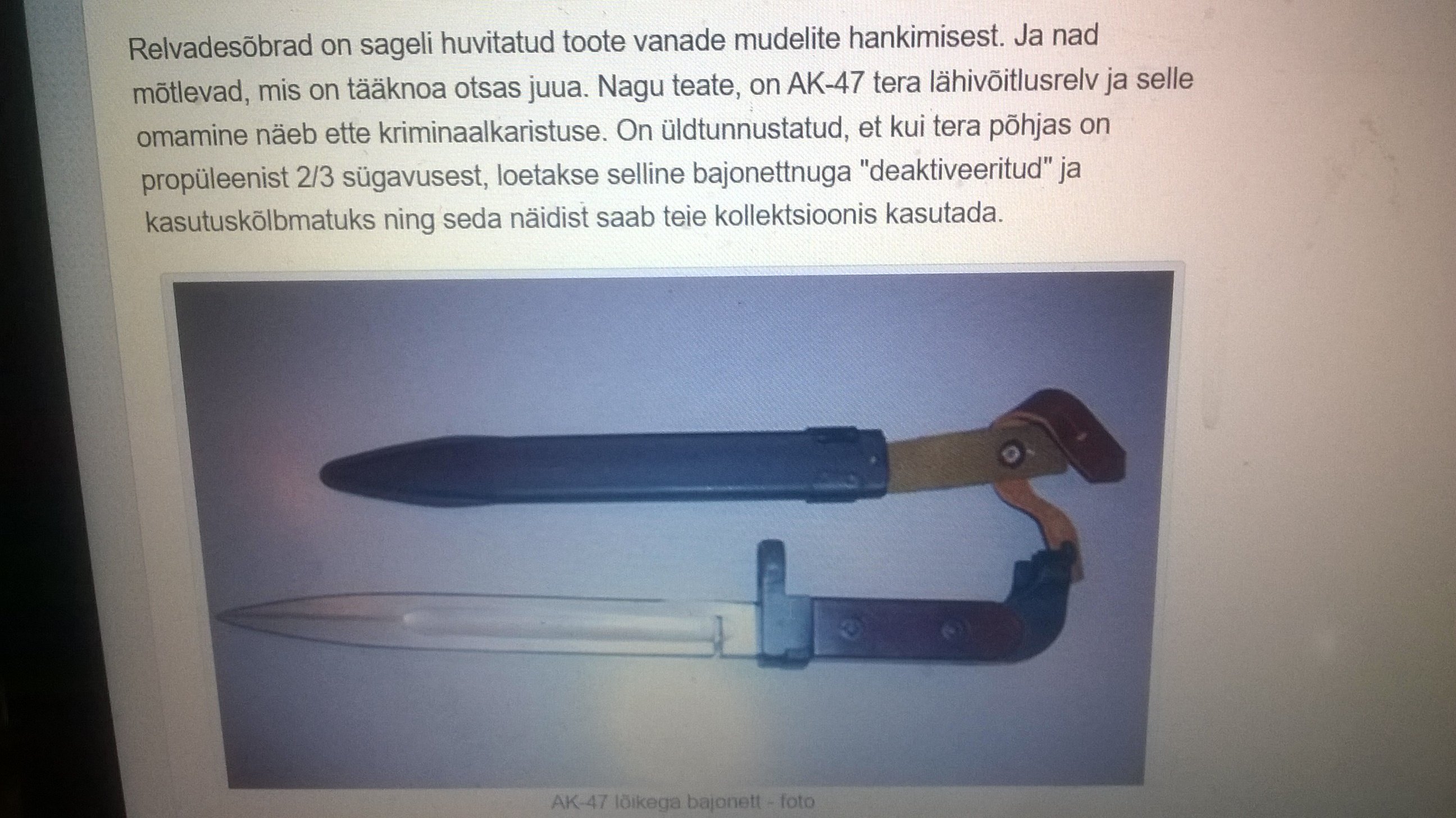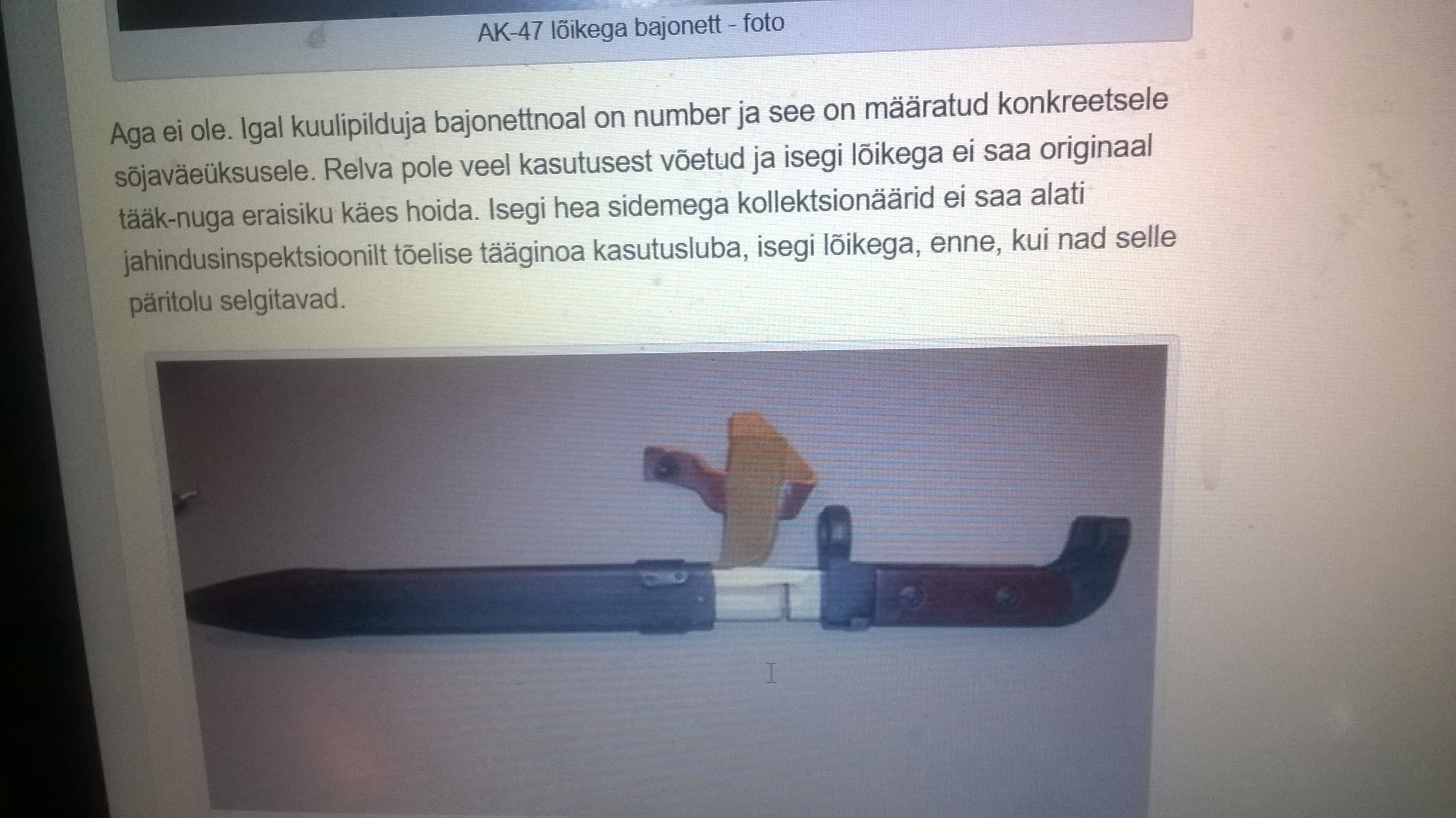 ..kuniks pole pilti ja/või viidet, on kogu bazaar mõttetuUmbes aasta tagasi oli ka Ostas müügis selliselt retsitud AK-47 tääk, kui ma ei eksi siis isegi Iževski tehase toode..