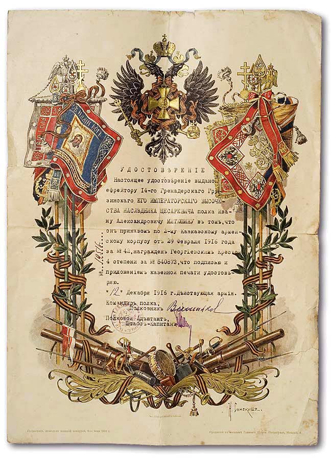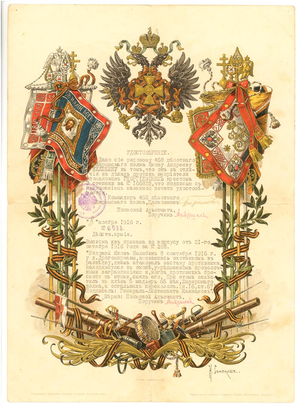 Награжден 25.11.1916 Его Императорским Высочеством Великим Князем